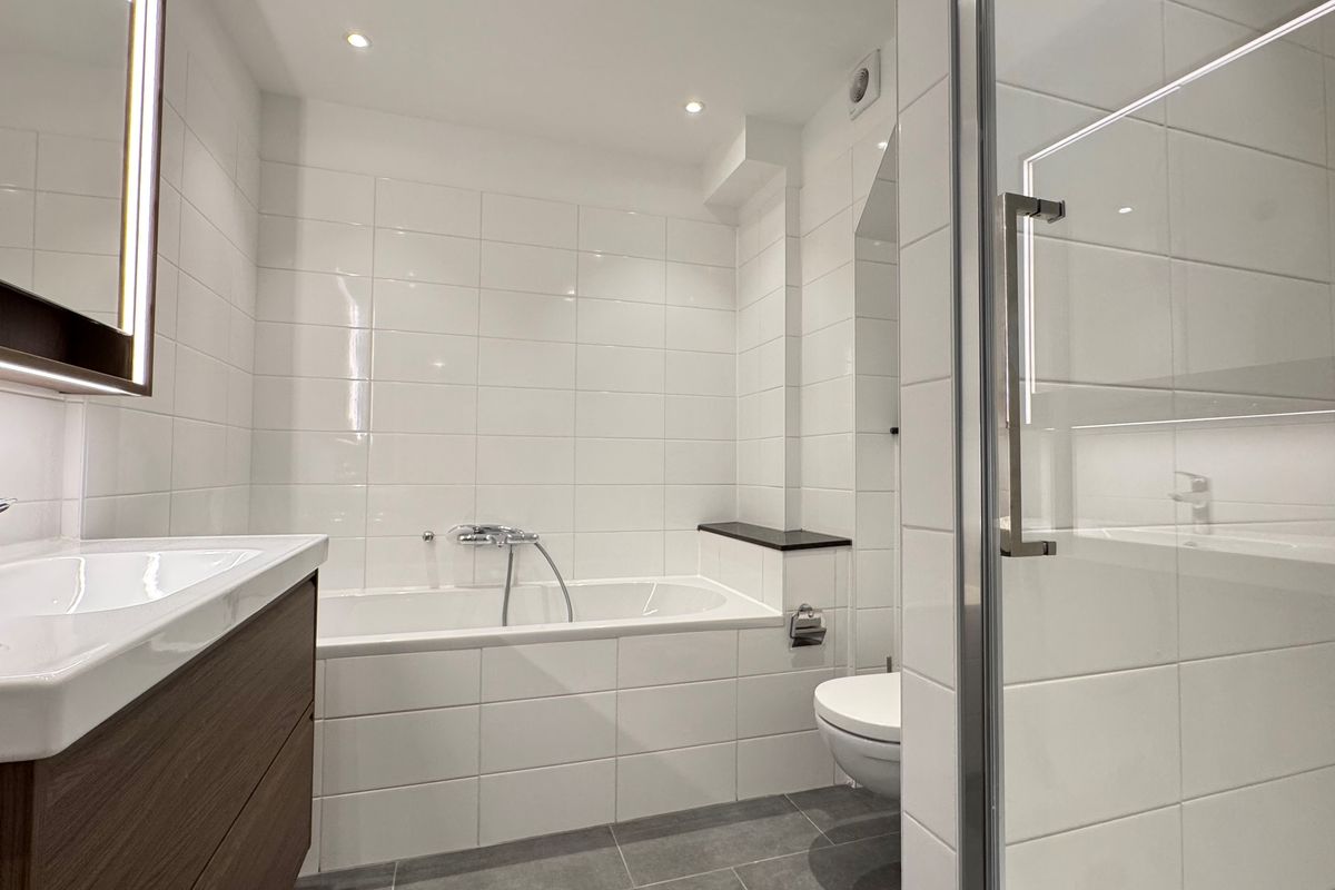De ruime eetkeuken aan de achterzijde is voorzien van moderne inbouwapparatuur en biedt toegang tot het balkon met uitzicht op de binnentuinen. In totaal zijn er drie slaapkamers, waarvan één met toegang tot een tweede balkon. Daarnaast zijn er twee badkamers, beide voorzien van douche, wastafel en één met ligbad. Op elke verdieping bevindt zich een separaat toilet.