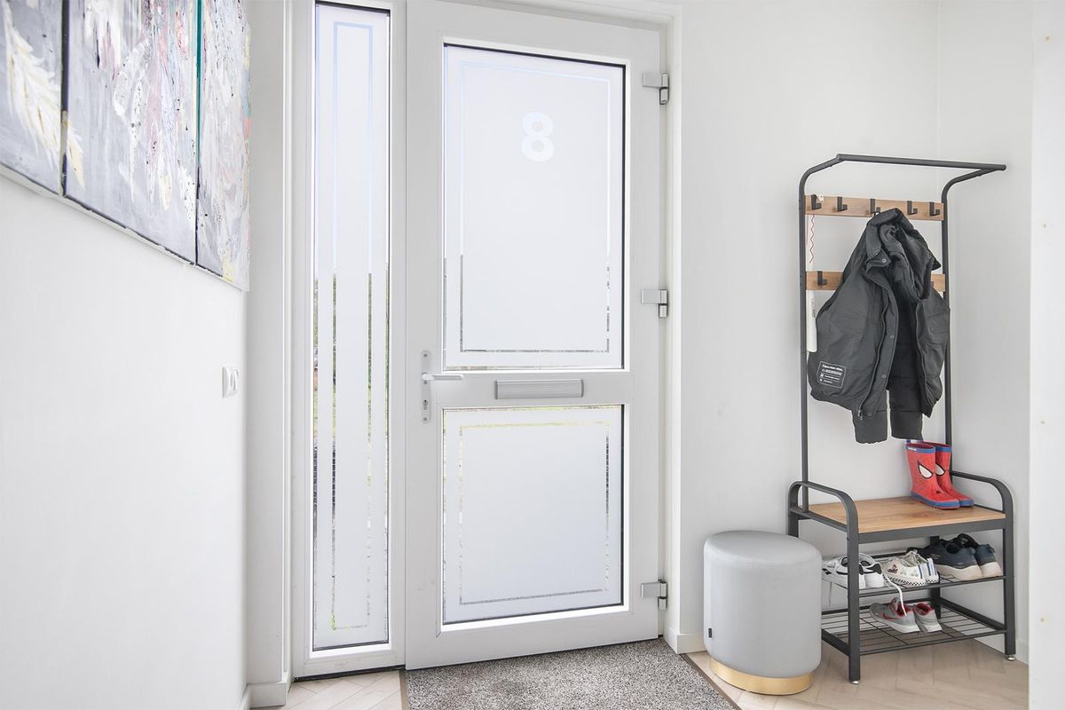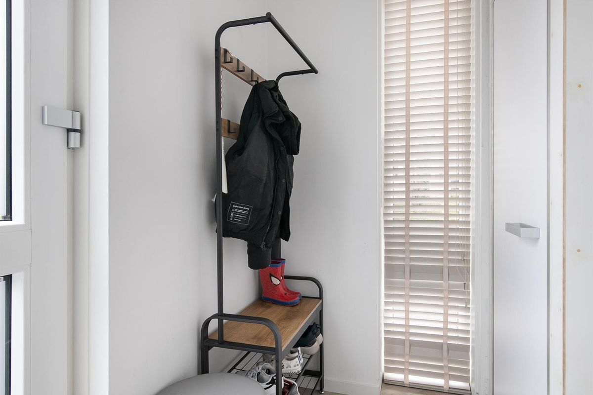 * Woningentree; hal met meterkast, gangkast met de verdeler van de vloerverwarming en witgoedaansluitingen.