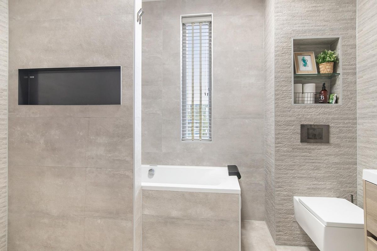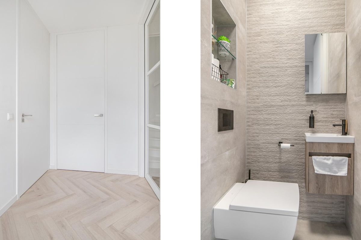 * Toiletruimte voorzien van moderne betegeling, wandcloset, fonteintje en een nis.