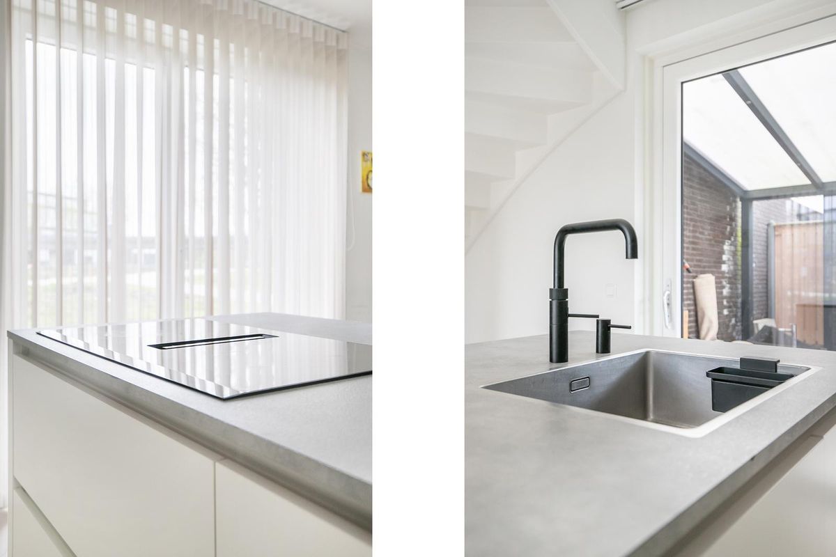* Royale, open woonkeuken met veel lichtinval, schuifpui naar de achtertuin en een trapopgang naar de eerste verdieping. De luxe inbouwkeuken met kasten in wandopstelling en kookeiland is voorzien van inbouwapparatuur: inductiekookplaat met down draft afzuiging, royale koelkast en vriezer, combimagnetron en vaatwasmachine.