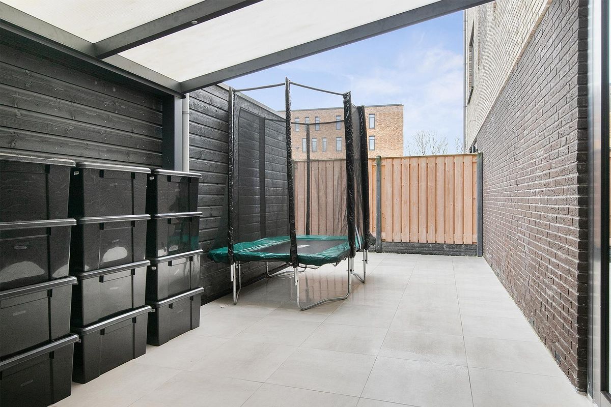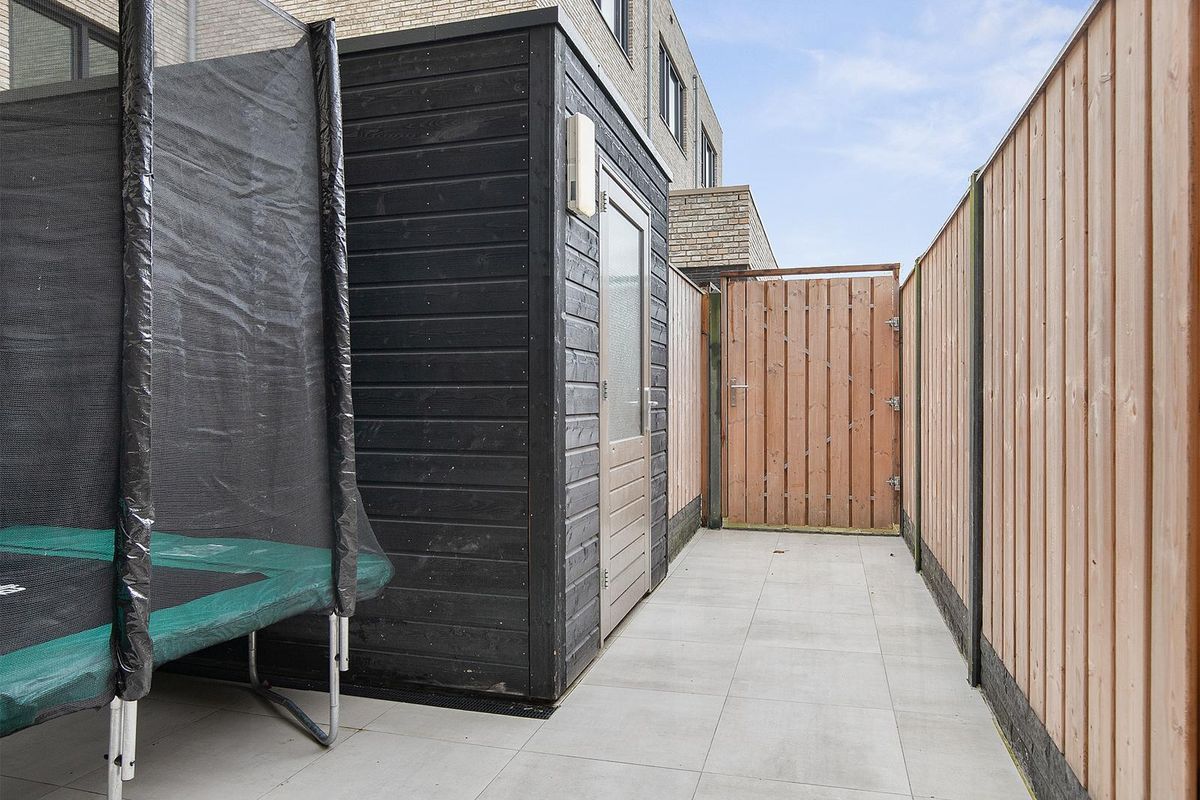 * Achtertuin gelegen op het noordwesten met een overkapping, schuur (ca. 6 m²) en toegang naar het hofje met privéparkeerplaatsen.