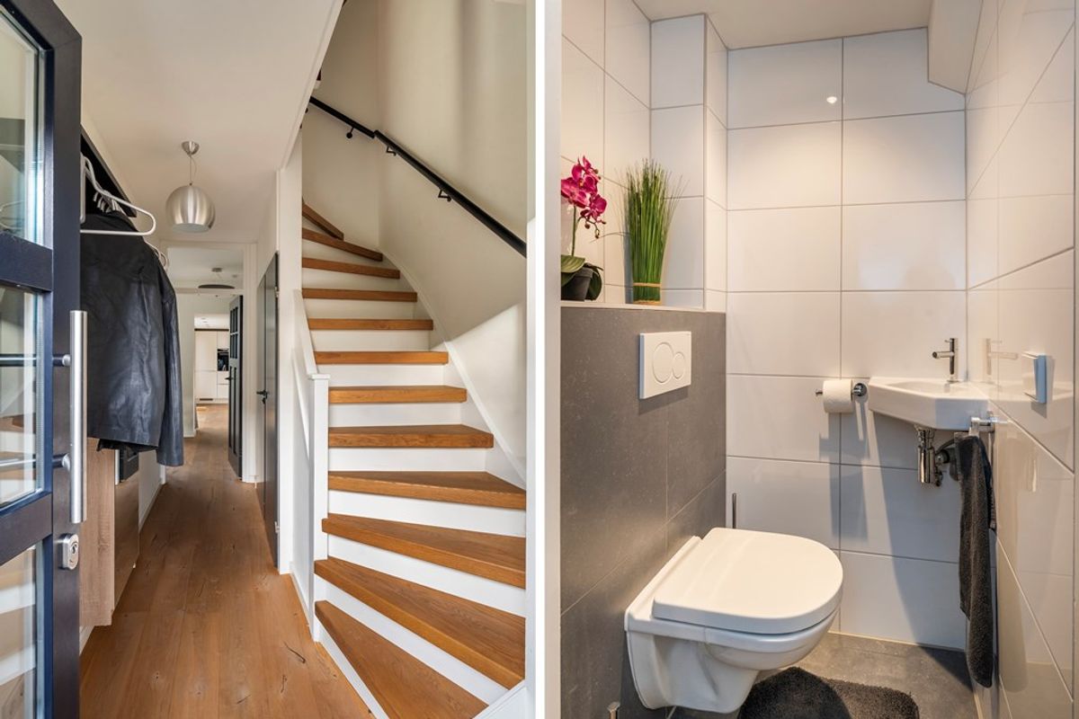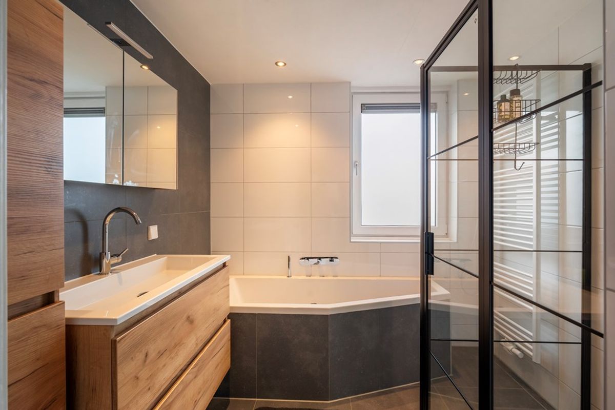 Overloop met toegang tot twee ruime slaapkamers (voor en achter), een stijlvolle badkamer, een separaat toilet met fonteintje én een aparte wasruimte – ideaal voor wasmachine, droger en extra opslag. De badkamer is recent vernieuwd en een waar plaatje: modern betegeld, met inloopdouche, ligbad en een fraai wastafelmeubel.