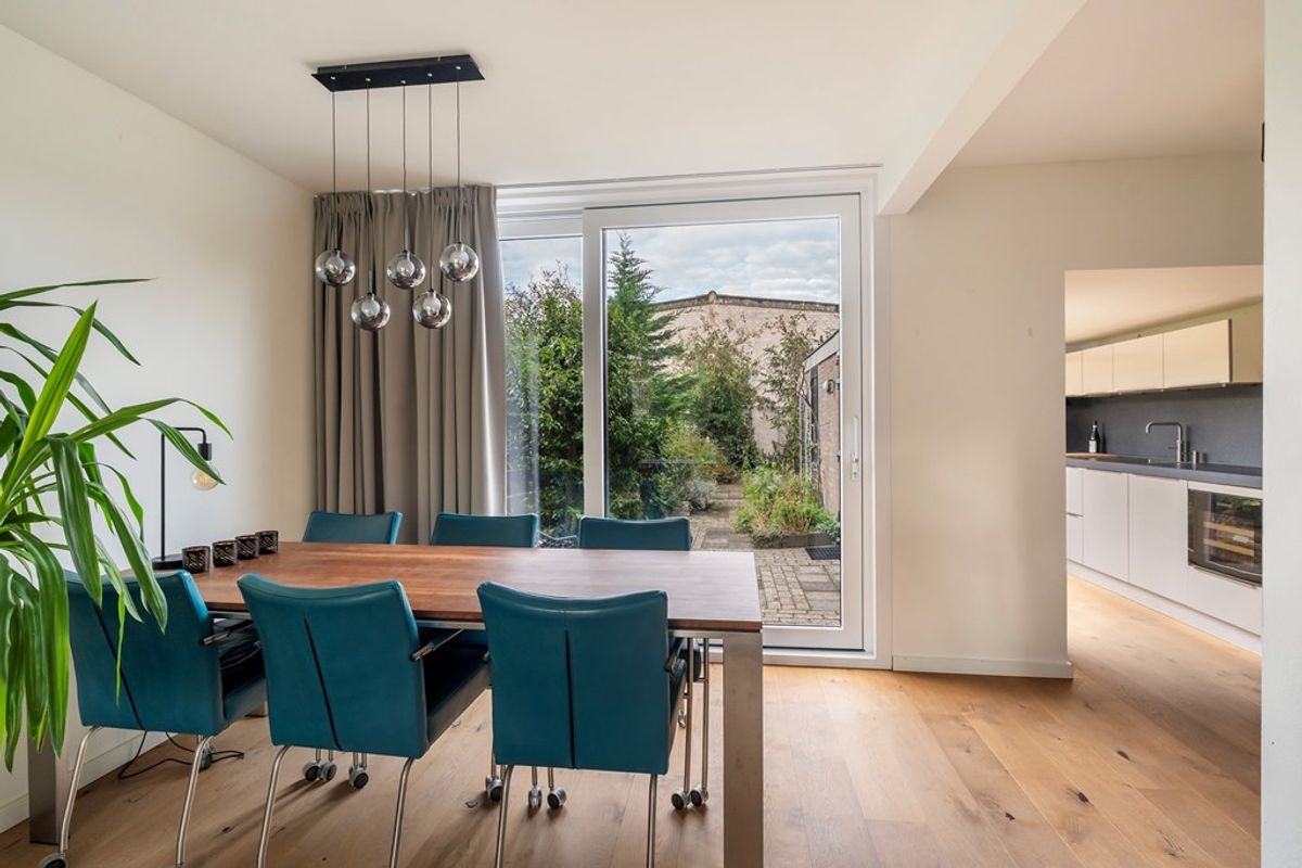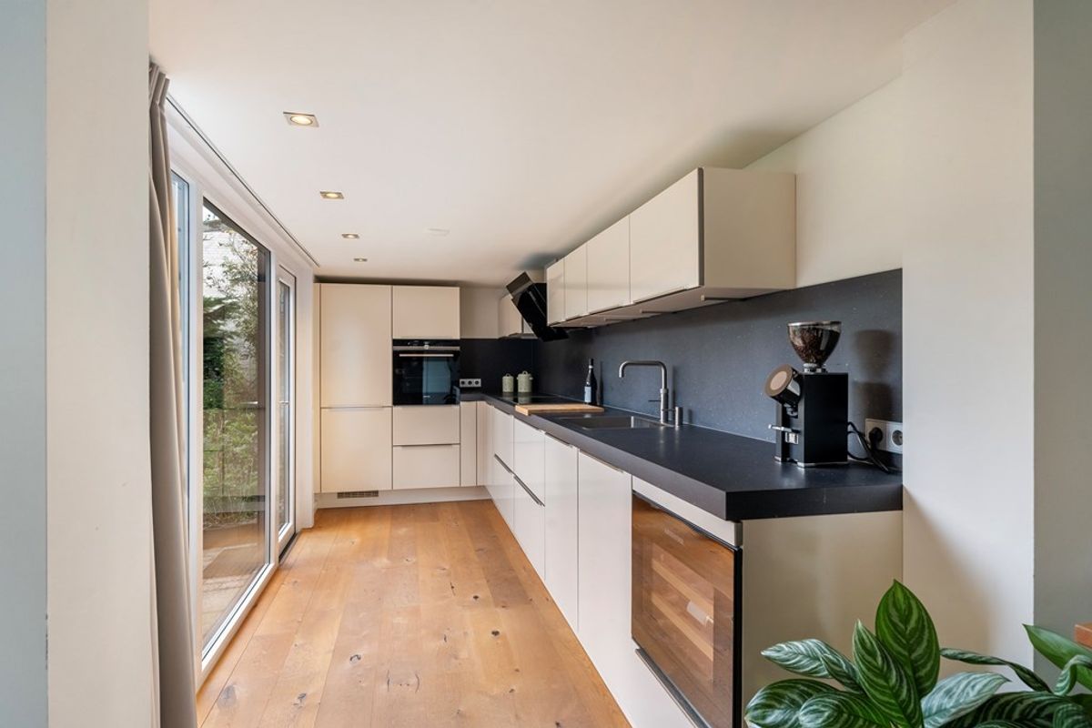 Aan de achterzijde is de woning uitgebouwd en voorzien van een moderne open keuken met veel licht inval door mooie, grote kunststof raamkozijnen. De keuken is compleet uitgerust met o.a. een inductie kookplaat, vaatwasser, afzuigkap, combi-oven, een Quooker COMBI+ en een luxe Liebherr wijnklimaatkast. Een plek waar koken en gezelligheid perfect samenkomen.
