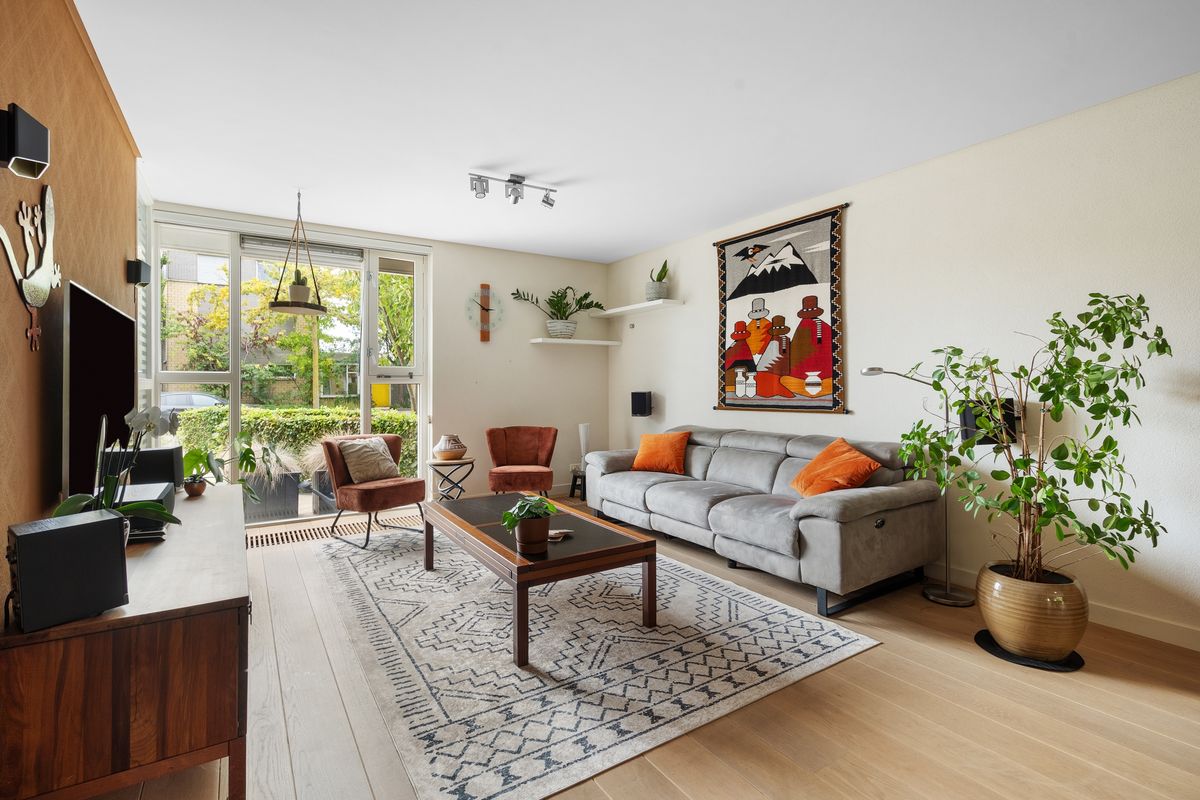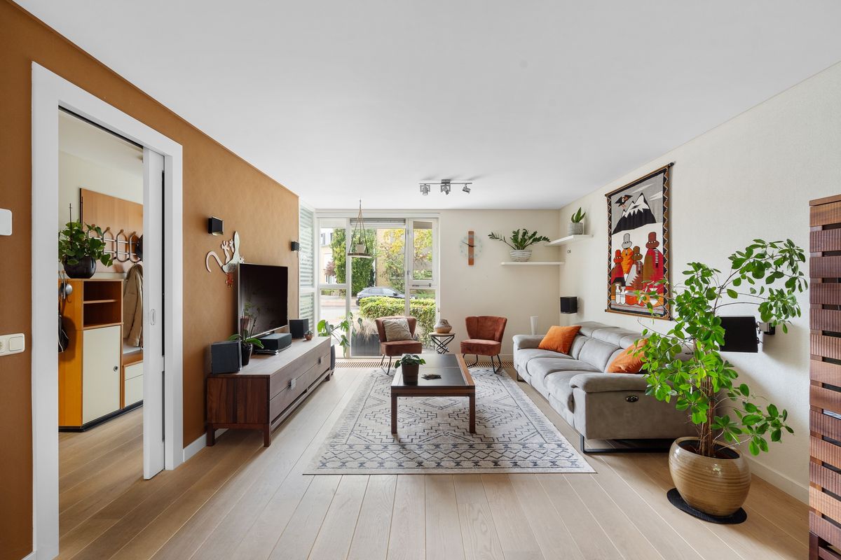 De imposante L-vormige woonkamer is heerlijk licht dankzij de grote raampartijen en biedt volop ruimte voor een comfortabele zithoek en een ruime eethoek. De woonkamer is voorzien van een massief Amerikaans eiken vloer met convectorputten. Vanuit de woonkamer zijn een handige trapkast en de open keuken bereikbaar.