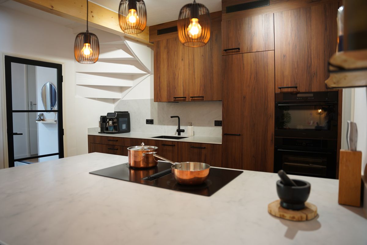 Een moderne stalen deur brengt je vervolgens in de open keuken.