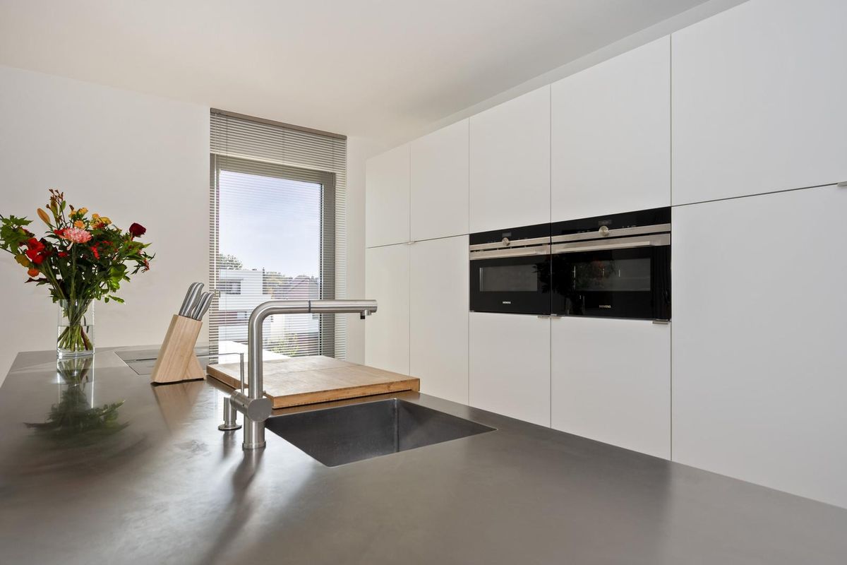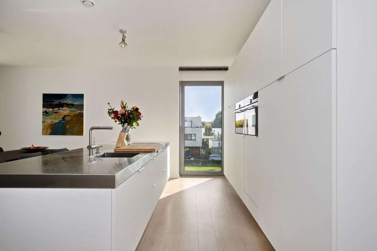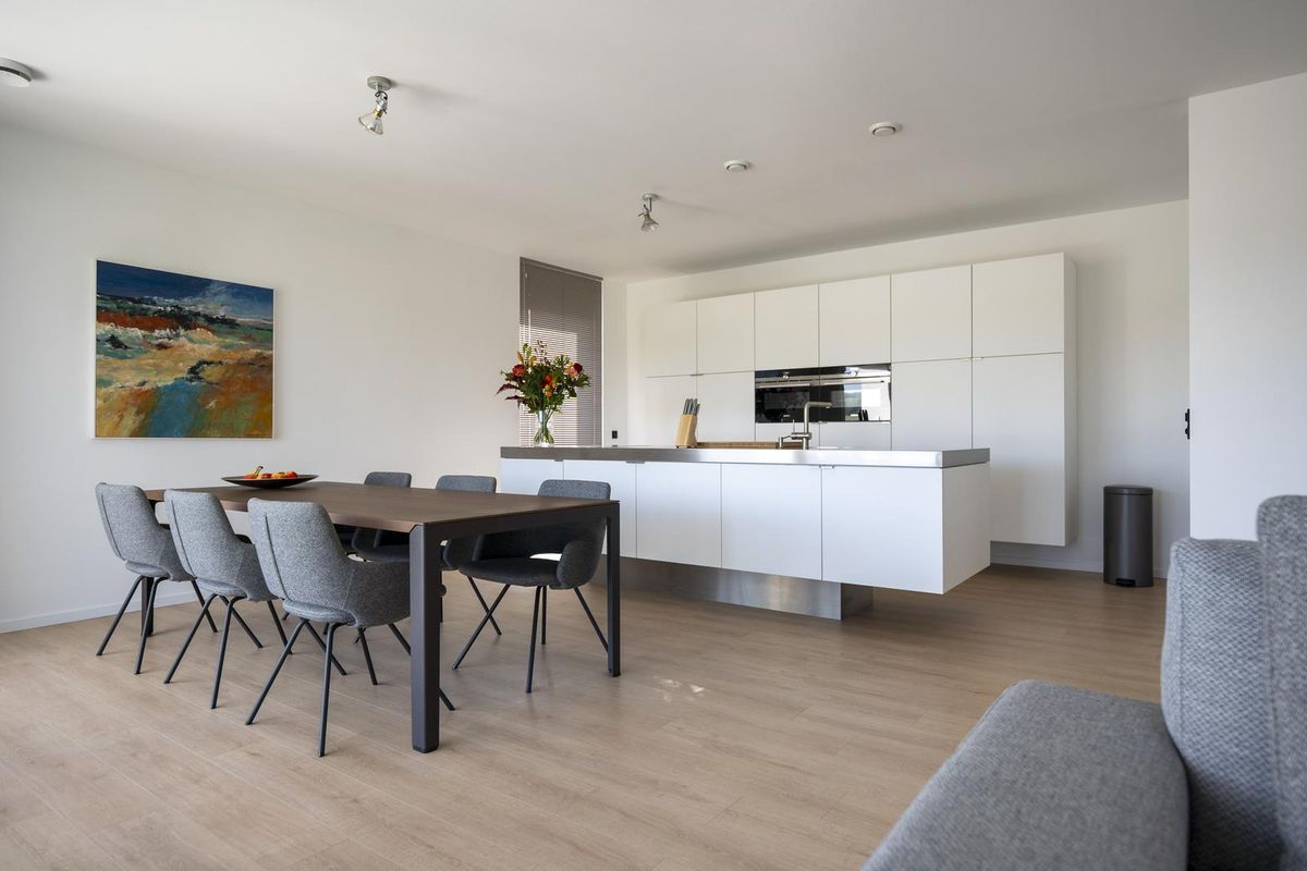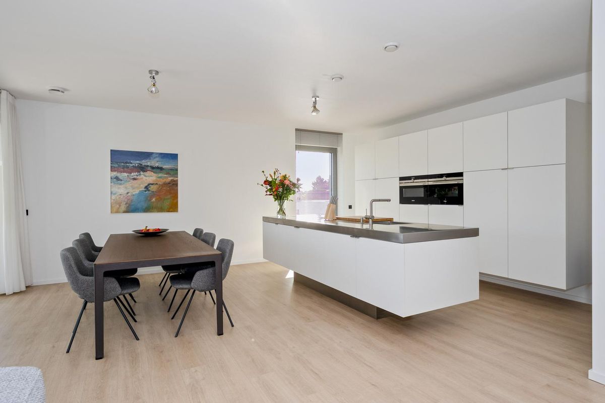 - De open woonkeuken (ca. 18 m²) met moderne keukenopstelling is voorzien van een kookeiland met RVS-werkblad, 4-pits inductieplaat met geïntegreerde afzuiging en wasbak. Verder beschikt de keuken over inbouwapparatuur als een heteluchtoven, magnetron, vaatwasser, en koelkast. De keuken is voorzien van veel kastruimte;