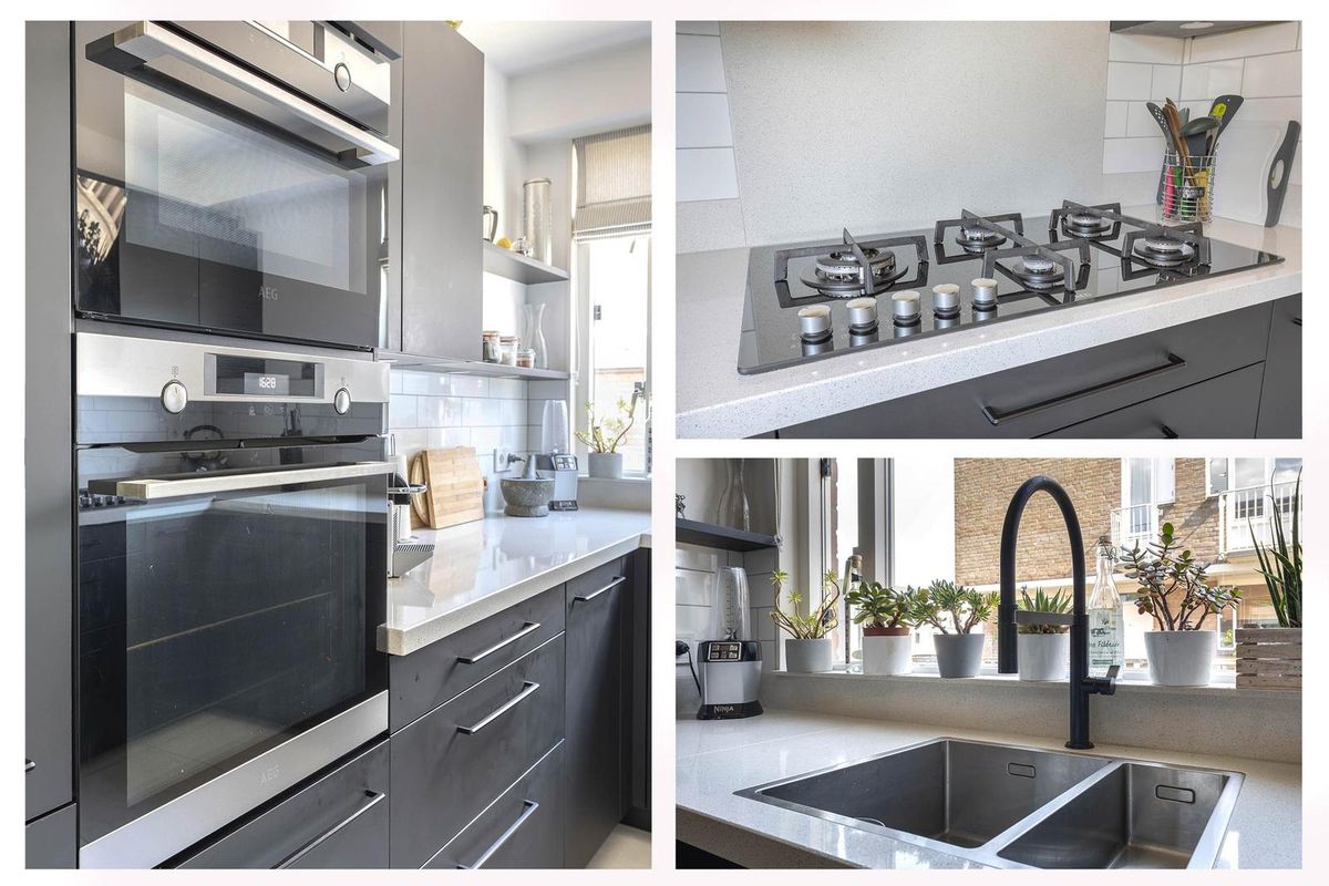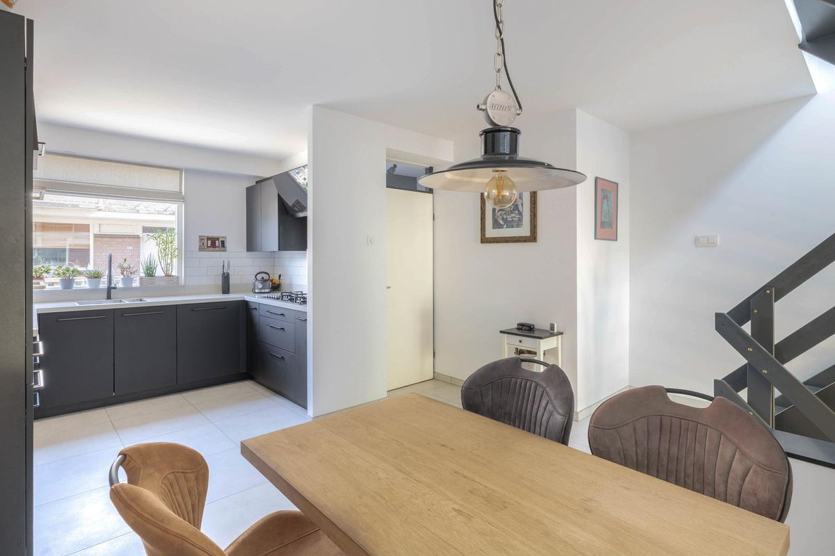 De hoofdentree ligt op de eerste verdieping. Hier kom je binnen in de sfeervolle woonkeuken (2020) met modern contrast in lichte en donkere tinten en uitgebreide inbouwapparatuur. Vanuit de woonkeuken heb je een fraai zicht op de lager gelegen woonkamer dankzij de speelse split-level indeling.