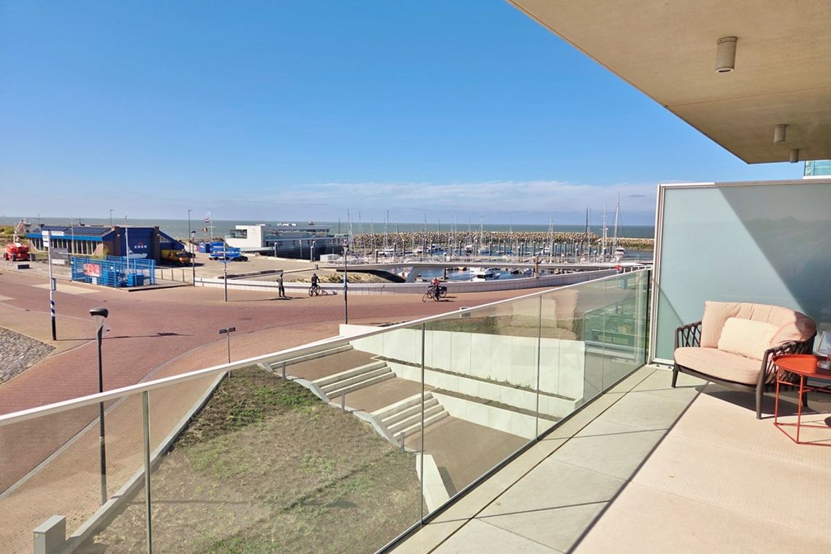 Ruim en zonnig balkon, toegankelijk via de woonkamer. Hier geniet u vanaf de middag tot zonsondergang van zon en een levendig uitzicht over zee, de jachthaven en de boulevard.