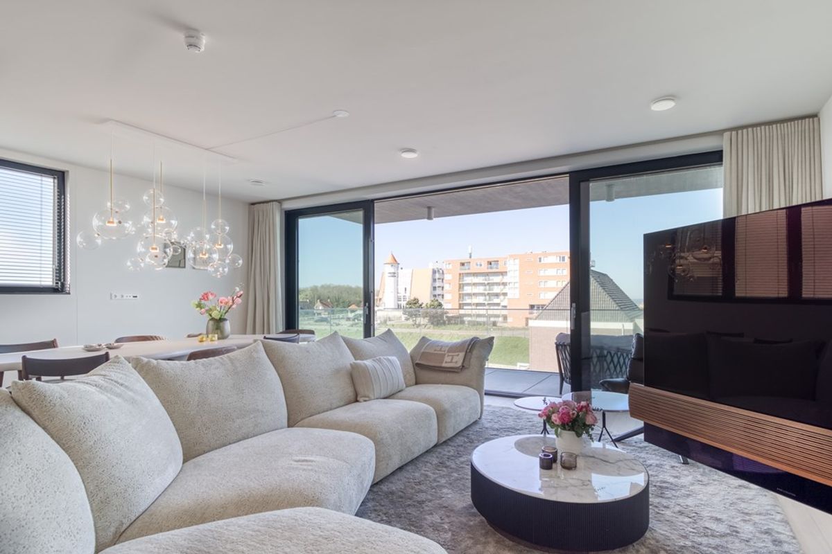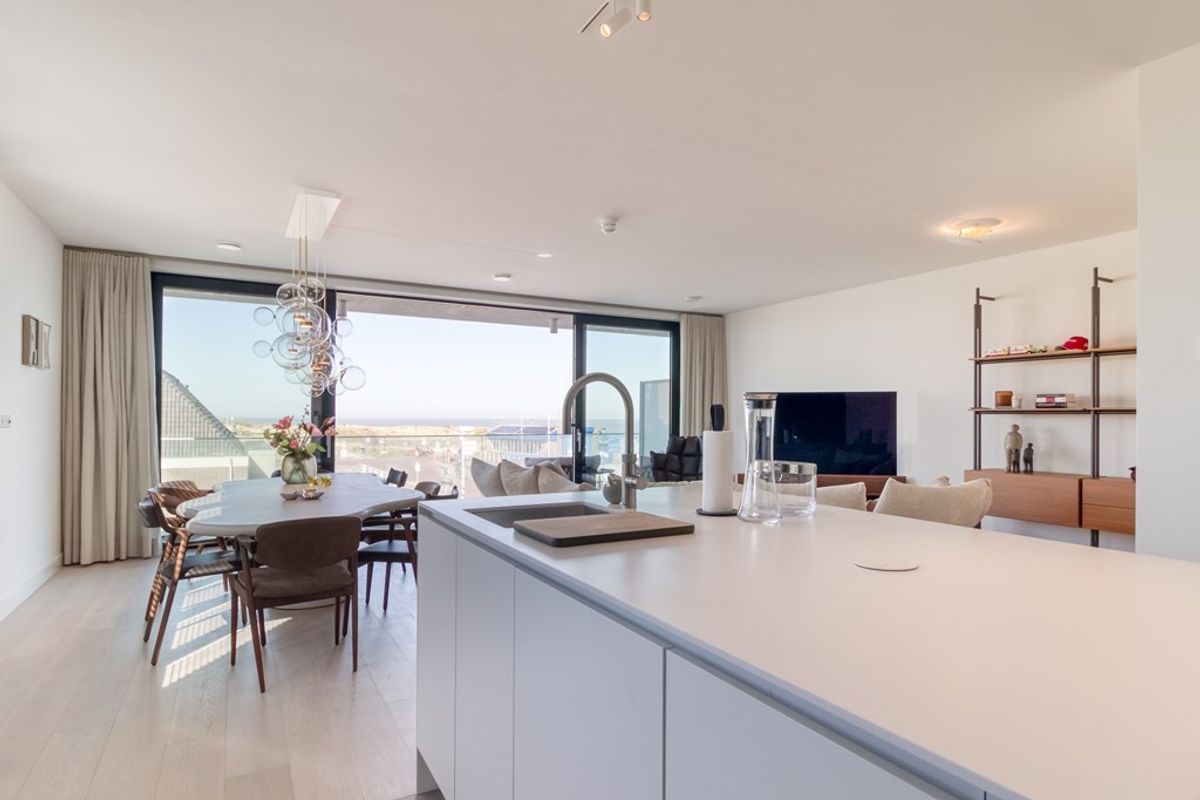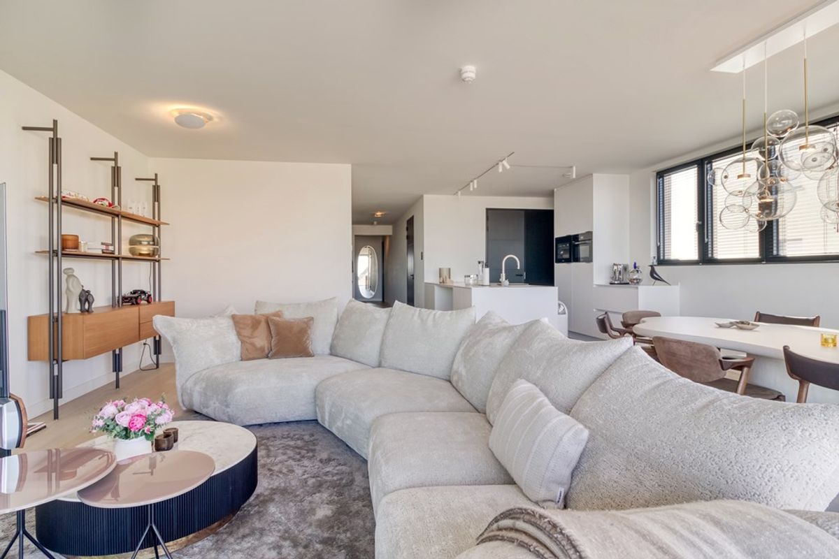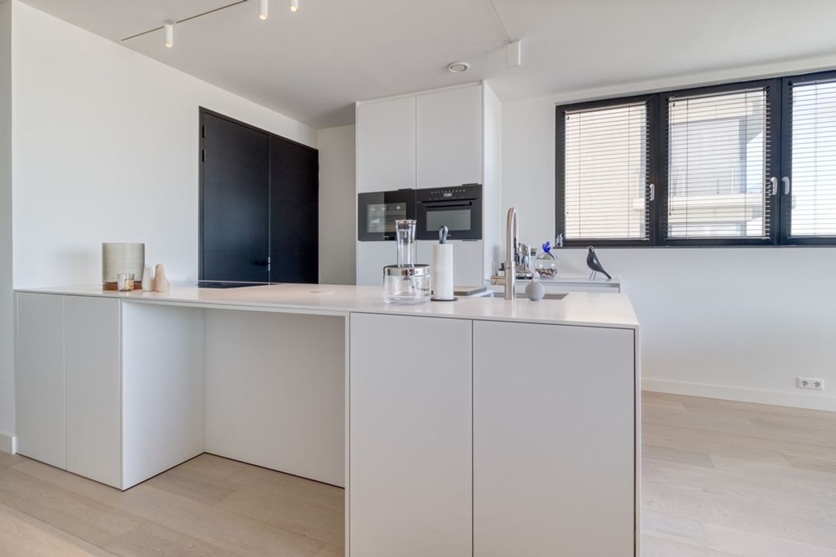 De woonkamer is licht en ruim opgezet, met grote raampartijen die zorgen voor een prettige sfeer en een mooi zicht op de omgeving. De open keuken sluit hier naadloos op aan en is uitgevoerd met moderne inbouwapparatuur, waaronder een inductiekookplaat met geïntegreerde afzuiging, wijnklimaatkast, vaatwasmachine, combi-magnetron, spoelbak, koelkast en tweede koelkast met vriesgedeelte.