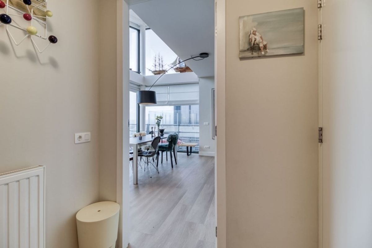 Via de trap of met de lift komt u op de 4e verdieping. Bij binnenkomst in het appartement komt u eerst in de hal met meterkast, garderobe en toilet met fonteintje.