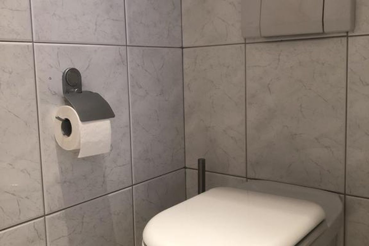 Portaal (bereikbaar vanuit de woonkamer) met geheel betegeld toilet met fontein.