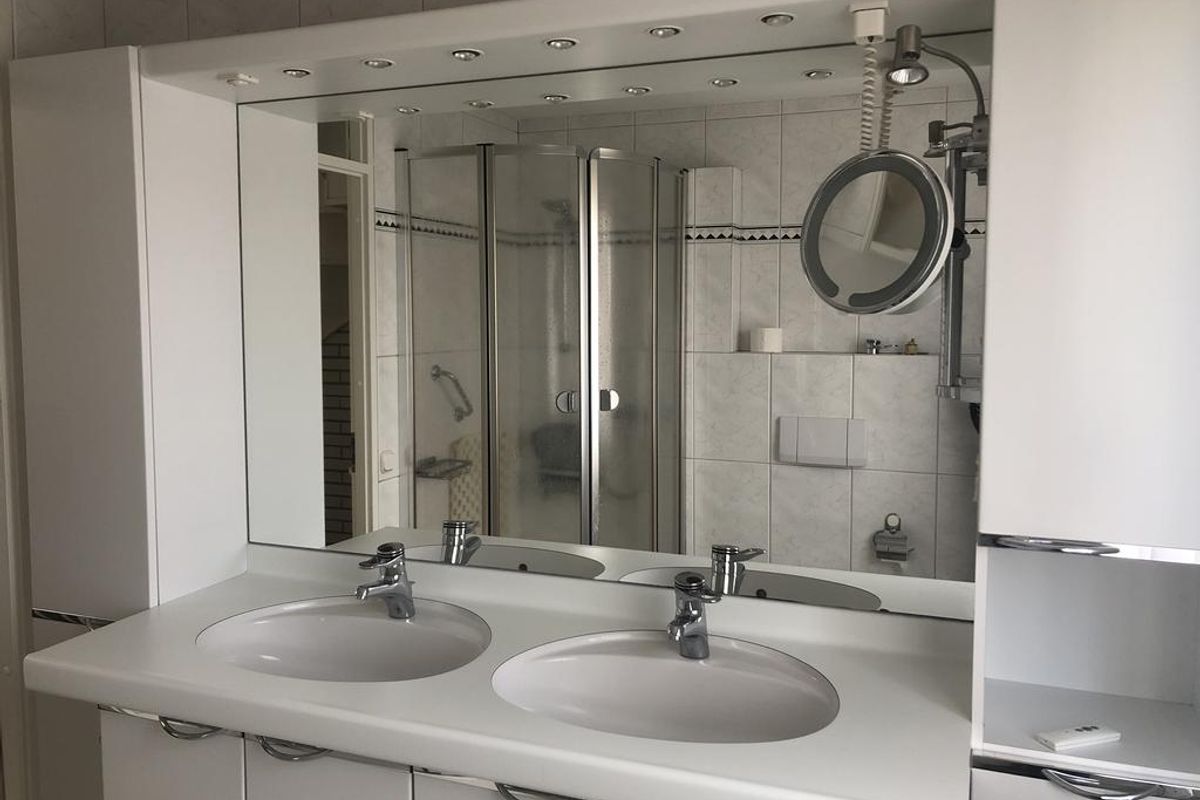 Overloop met toegang tot de 2 slaapkamers (resp. ca. 20 m² en 12 m²). De ouderenslaapkamer is voorzien van een airco. Geheel betegelde badkamer met toilet, bidet, douche en dubbele wastafel met ruim wastafelmeubel.