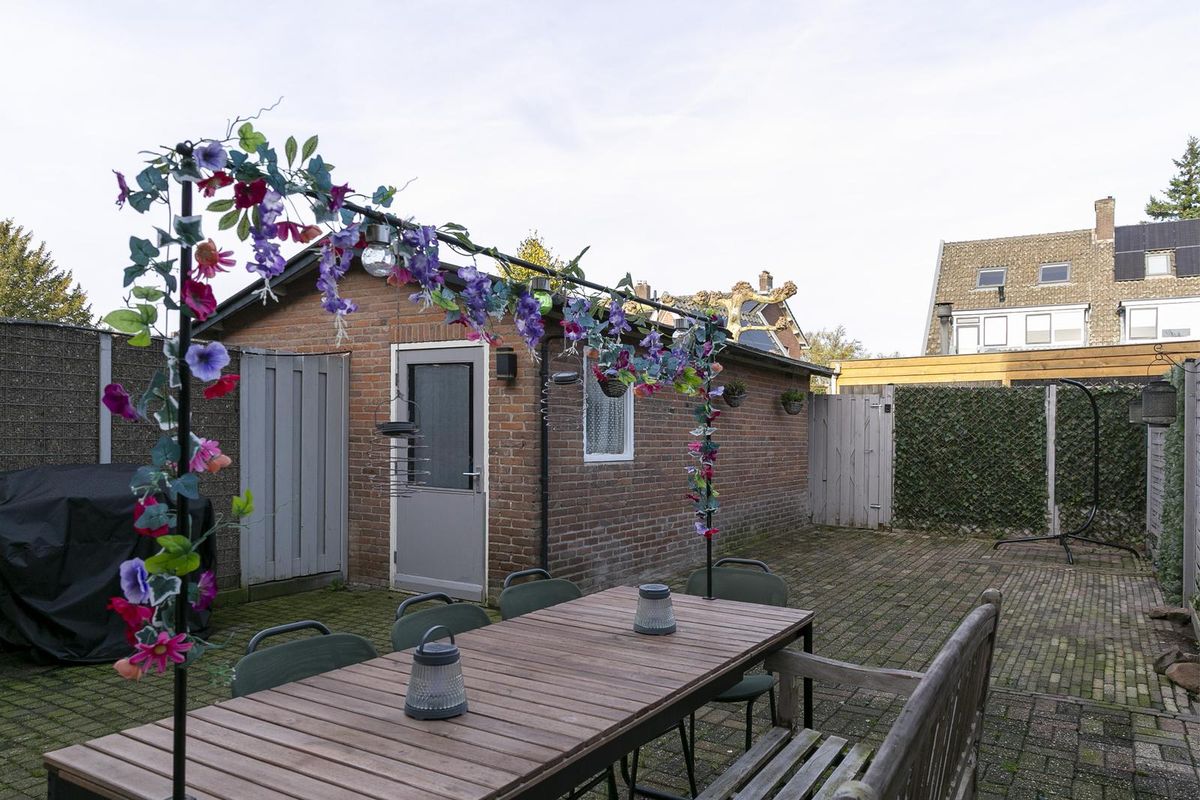 In de tuin vind je een stenen berging, handig voor fietsen en tuingereedschap, en er is een achterom aanwezig.