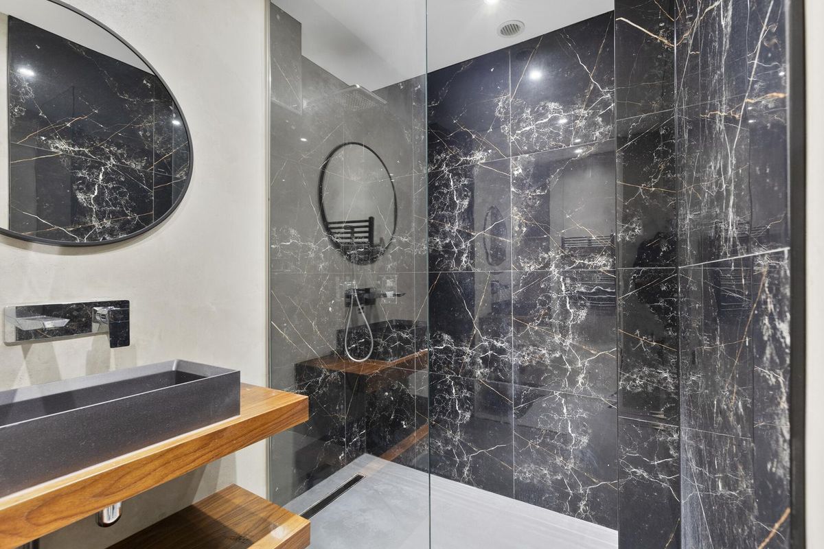 - Badkamer: De badkamer is modern en luxe uitgevoerd met een ruime inloopdouche en een stijlvol wastafelmeubel met houten details. De vloer is strak afgewerkt in een lichte betonlook, terwijl de wanden deels zijn voorzien van marmeren tegels en deels van glad stucwerk.
