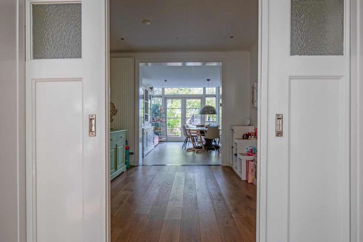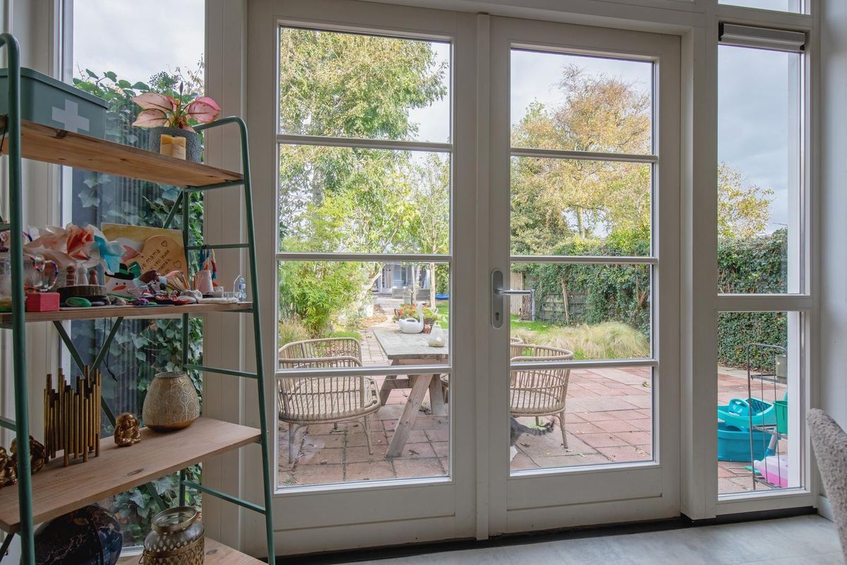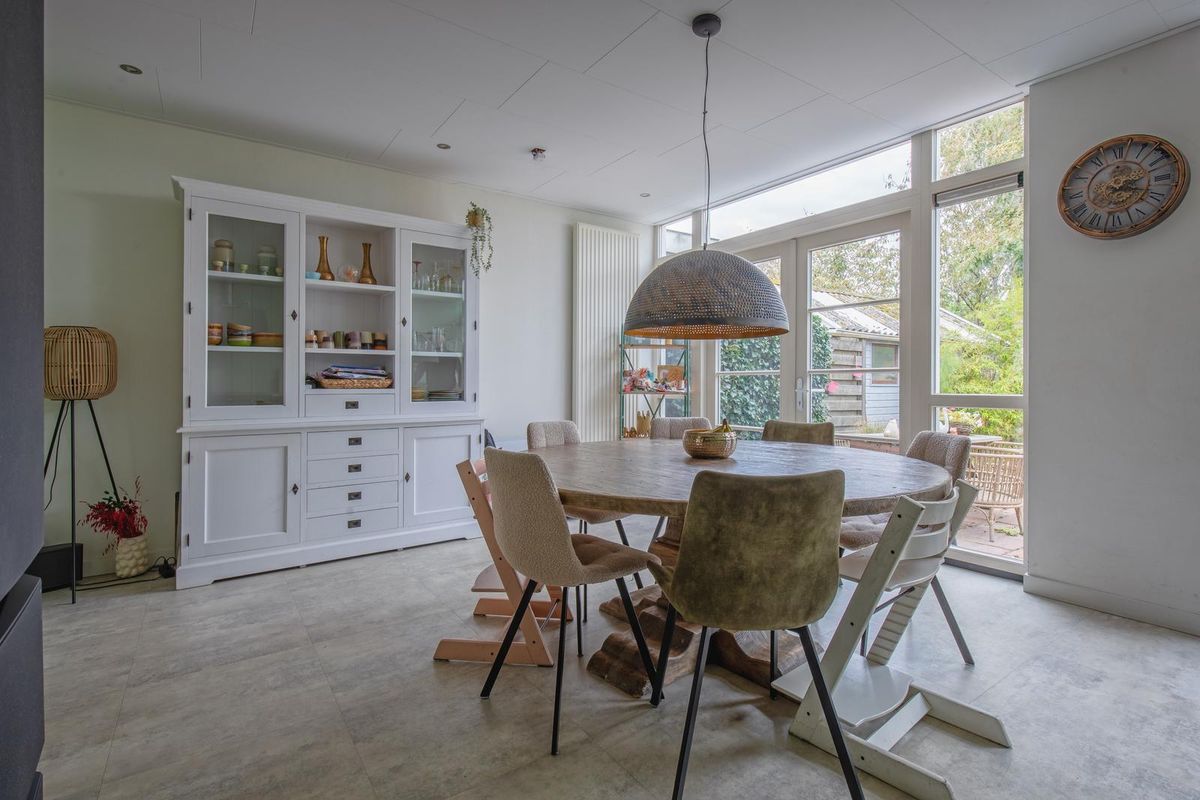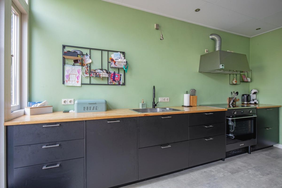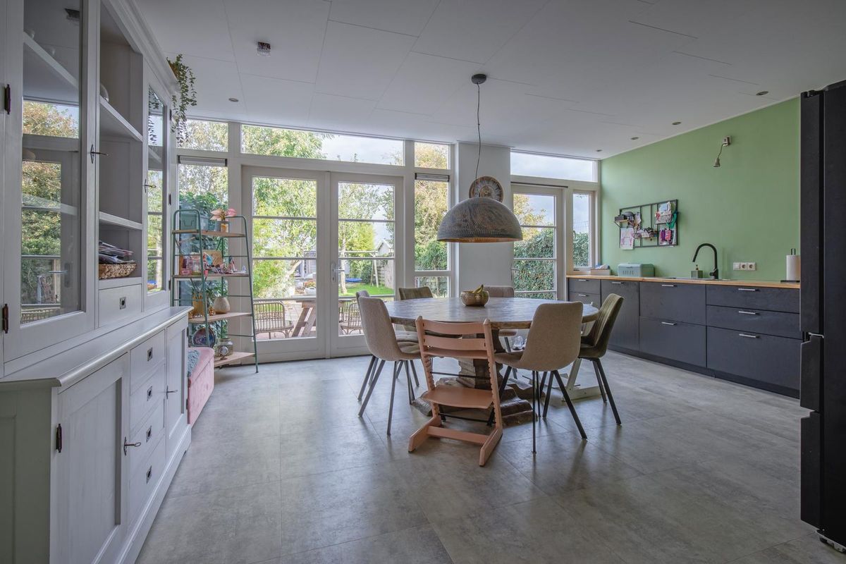 De lichte, ruime keuken is aan de achterzijde van de woning en heeft een fijne inrichting. De keuken is uitgevoerd met koelkast, SMEG-fornuis met inductiekookplaat en oven, dubbele spoelbak, afwasmachine en afzuigkap. Openslaande deuren geven toegang tot de tuin.