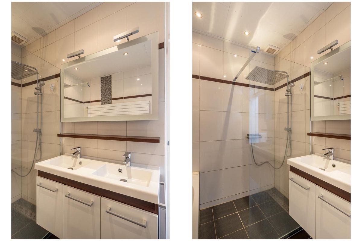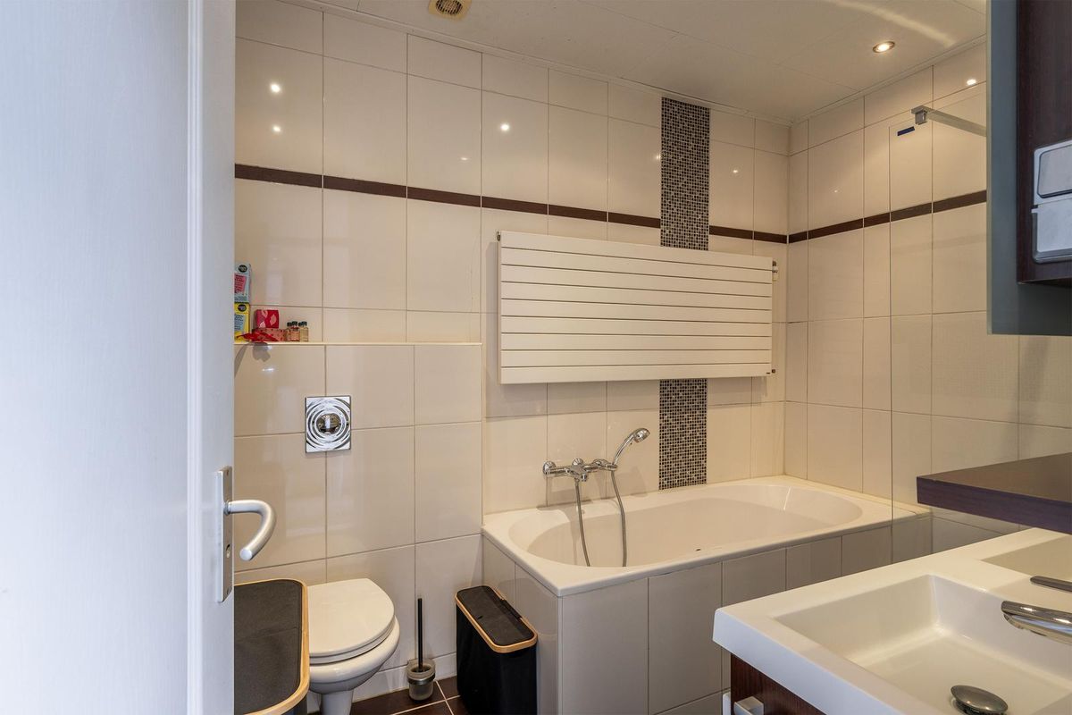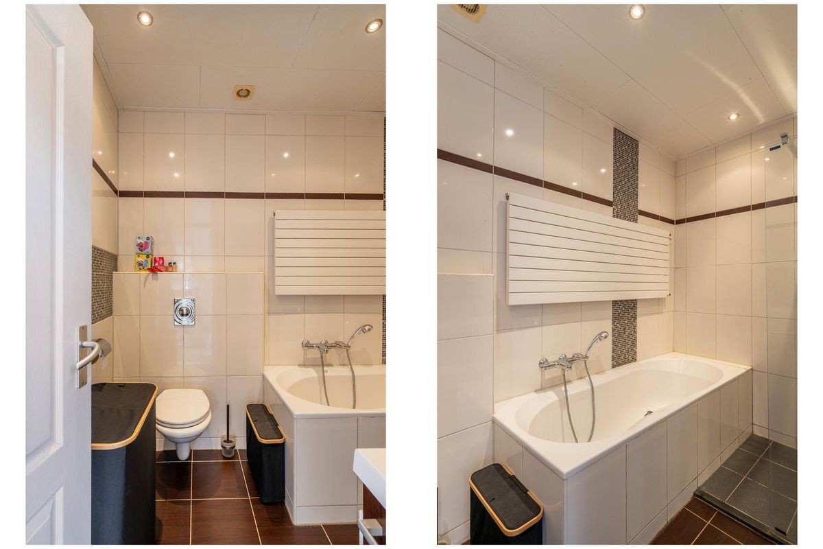 De badkamer is volledig betegeld en modern ingericht met een ligbad, inloopdouche, dubbele wastafel met meubel, hangend toilet en een designradiator.