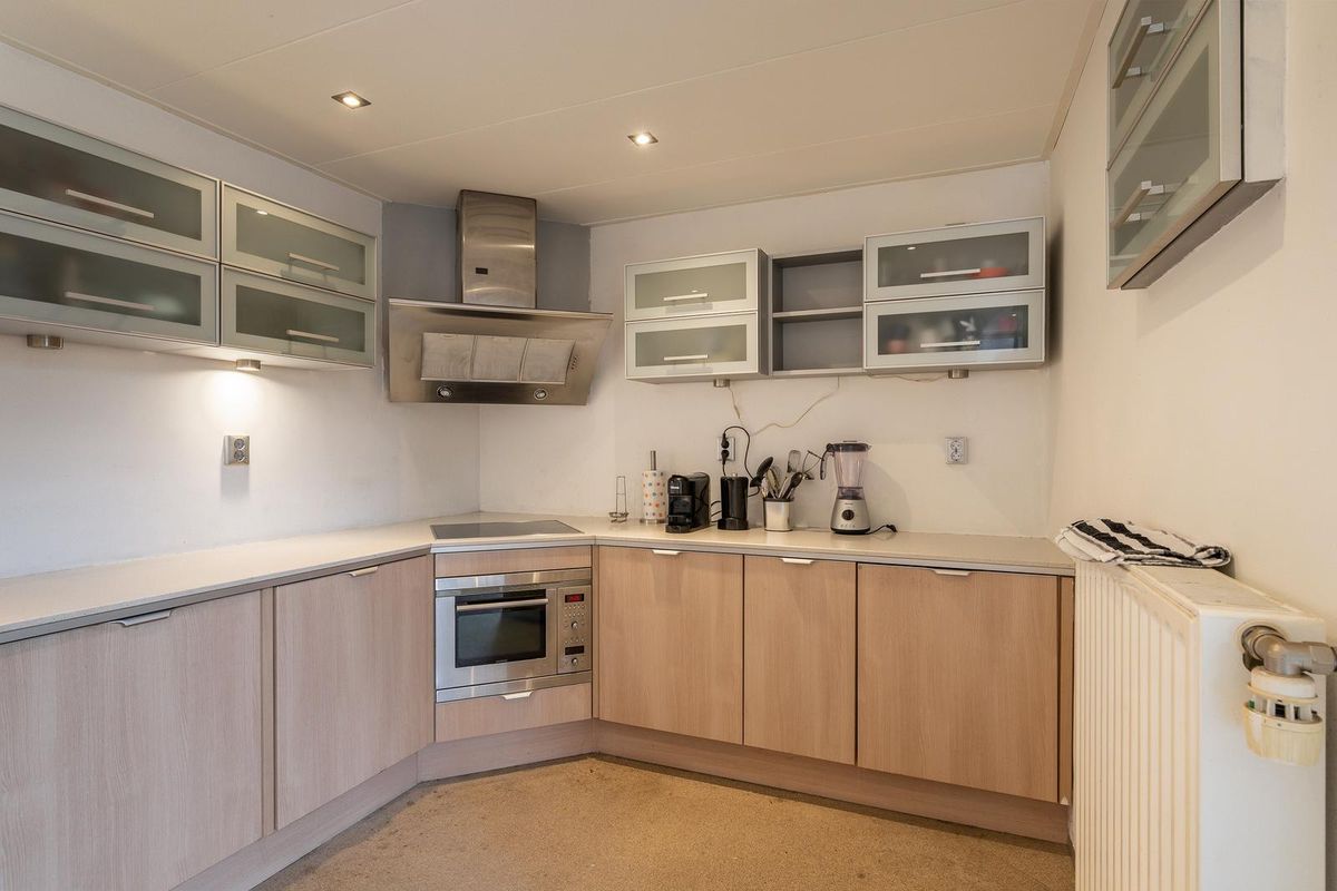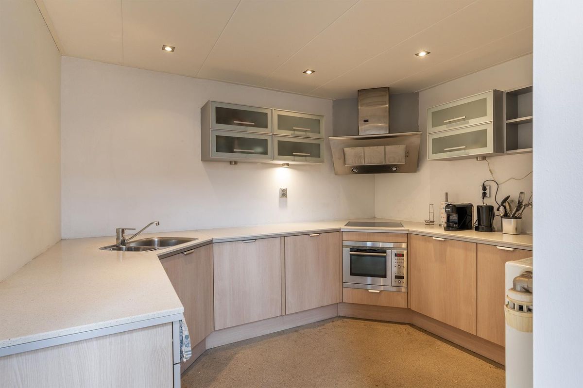 De keuken is uitgevoerd in een praktische U-vormopstelling en voorzien van alle gemakken. Zo beschik je over een composiet werkblad, koelkast, vriezer, vaatwasser, combi-magnetron, 1½ RVS spoelbak en een keramisch kookplaat – alles wat je nodig hebt om comfortabel te koken.