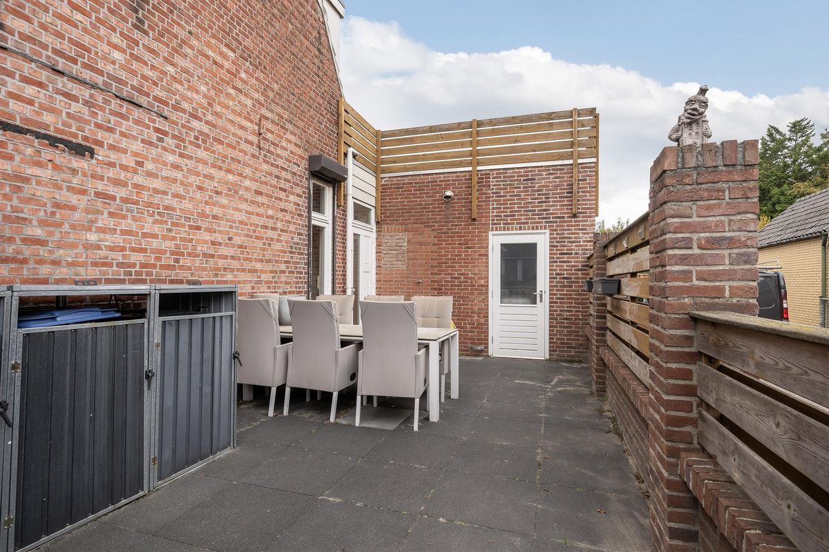 Fijne zijtuin - gelegen op het noordoosten - met sierbestrating, brede houten poort en een aangebouwde berging met vliering (circa 1.50 x 2.30 m.) met elektra en witgoedaansluiting.