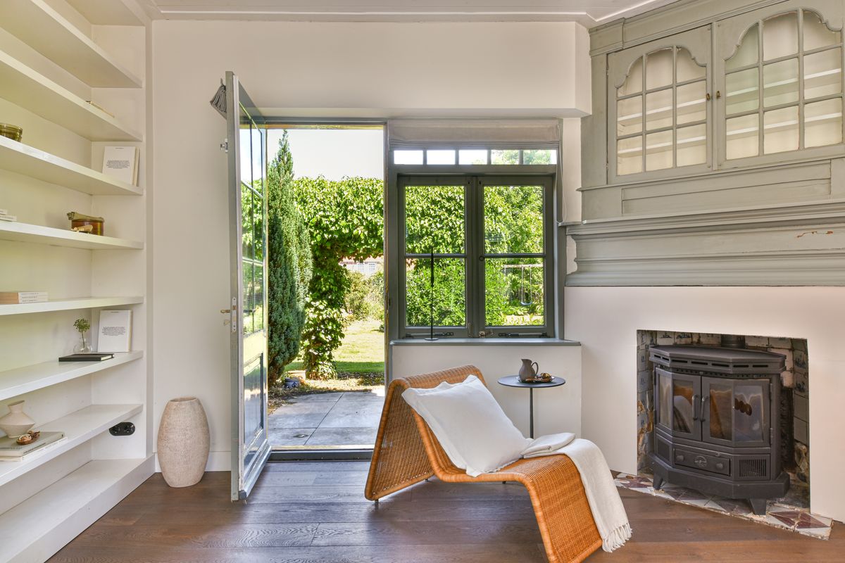 Vanuit de hal betreedt u een royale doorloopkamer die op verschillende manieren gebruikt kan worden — als werkruimte, atelier of extra zitkamer. De kamer ademt rust en eenvoud, met het licht dat op natuurlijke wijze binnenvalt via de ramen met karakteristieke roedeverdeling. Vanuit hier is er toegang tot de moderne badkamer én tot een charmante (slaap)kamer, die dankzij het raam met roedeverdeling een prachtig uitzicht biedt op de groene achtertuin.