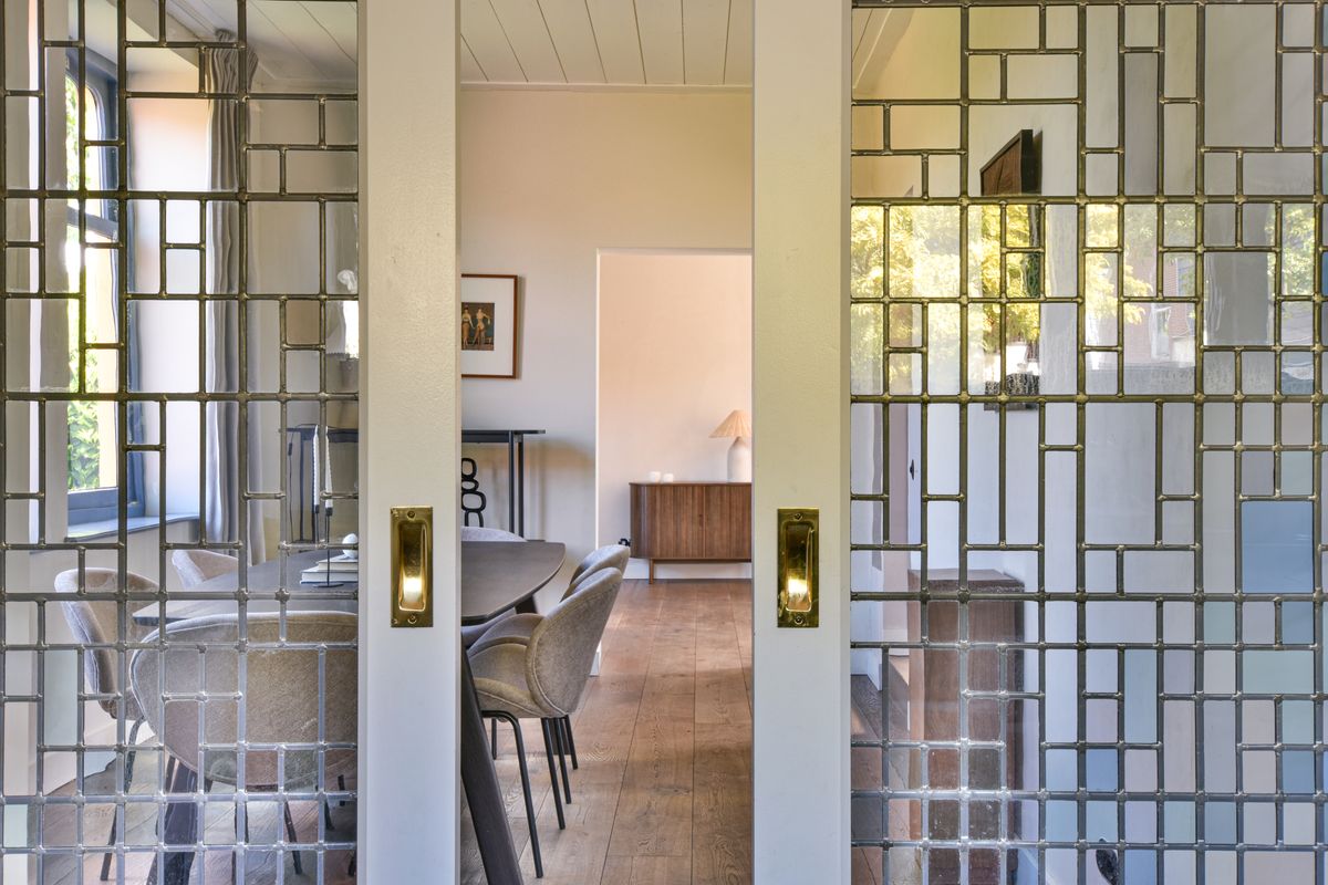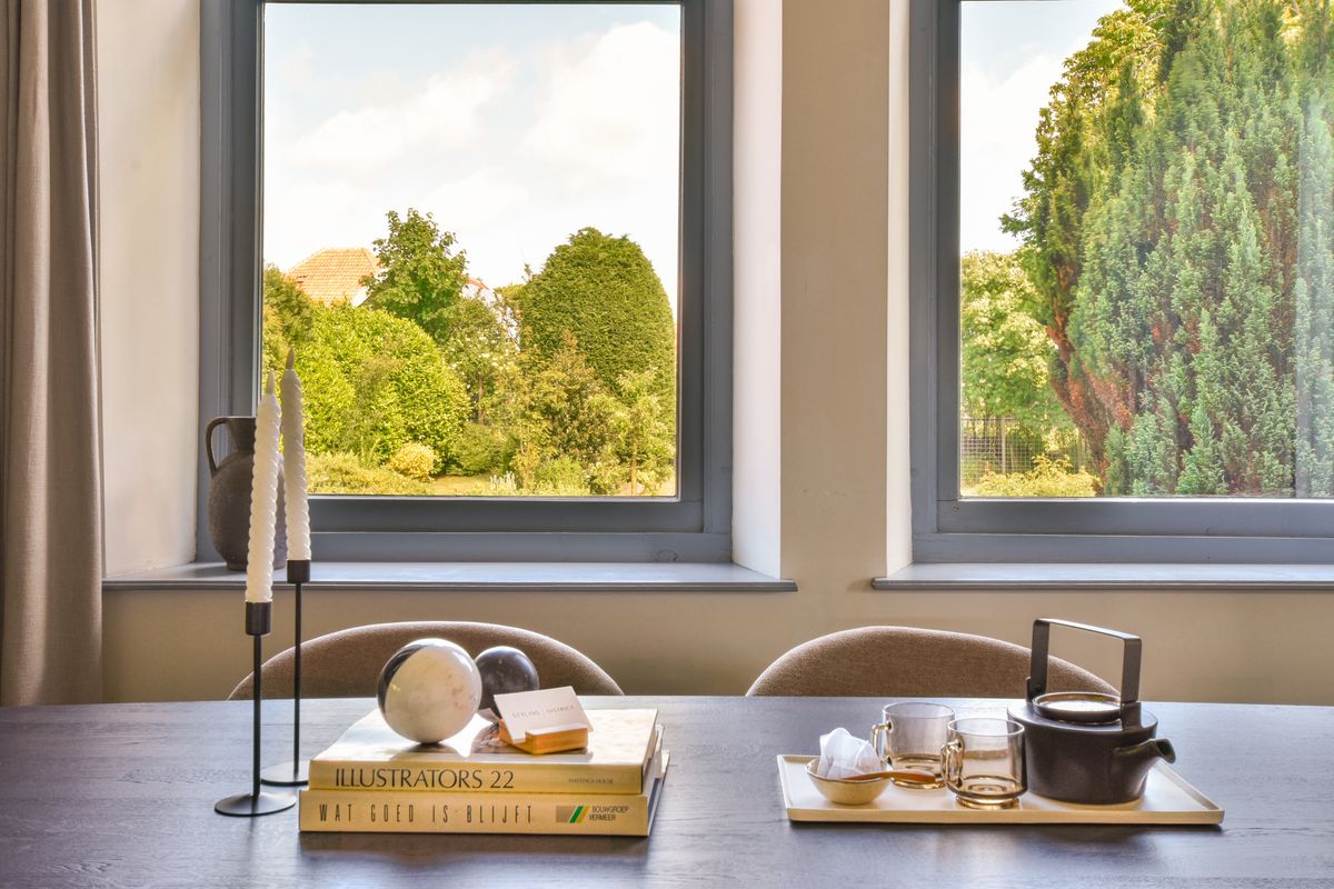 Wanneer u vanuit de tuin naar de woning kijkt, lijkt de tijd even stil te staan. Het weelderige groen omlijst de gevel als een levend schilderij, terwijl de karakteristieke raampartijen met hun sierlijke ruitjes een bijna betoverende uitstraling geven. Het geheel ademt een romantische sfeer . Een zeldzame harmonie tussen natuur en architectuur geeft dit huis zijn unieke ziel.