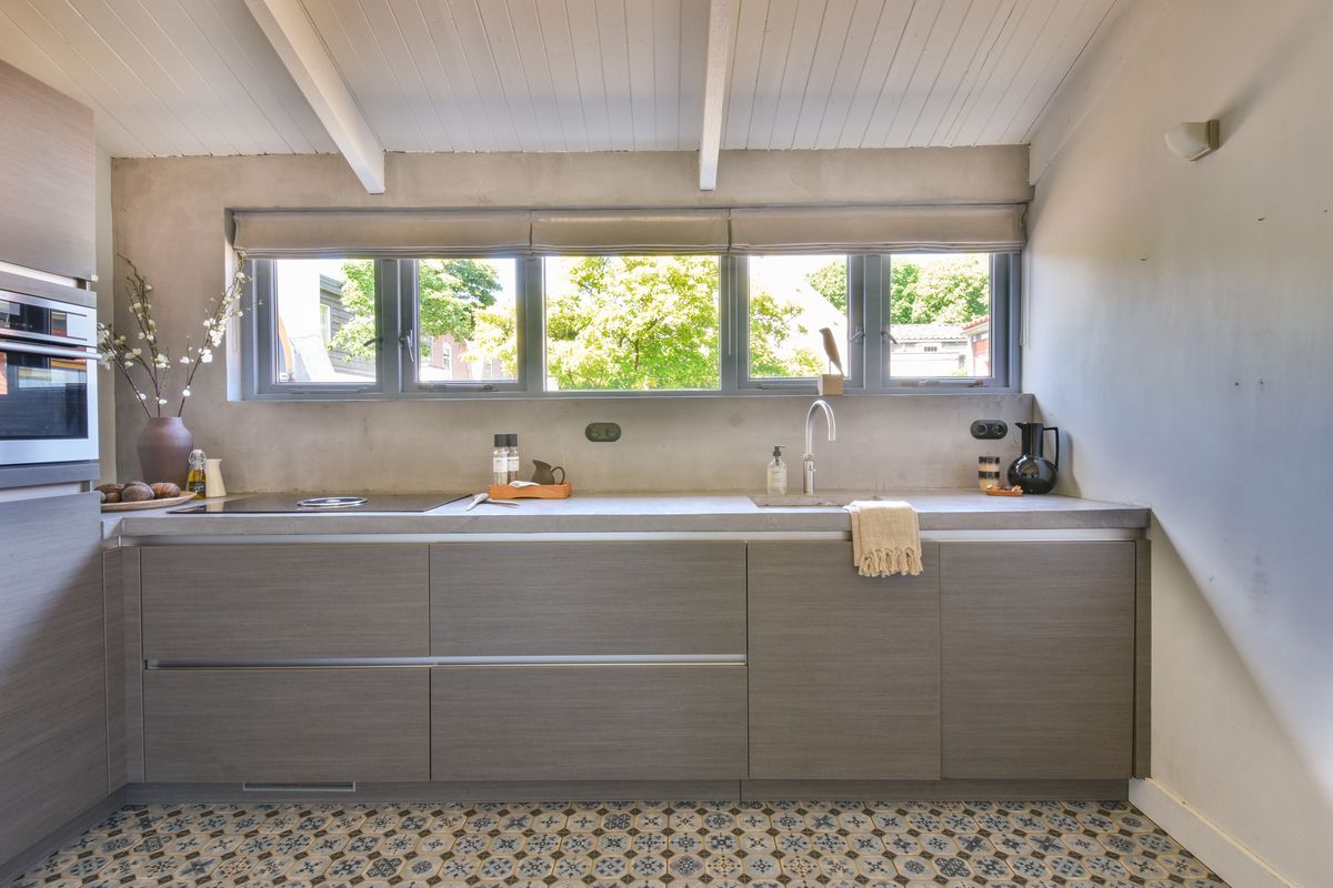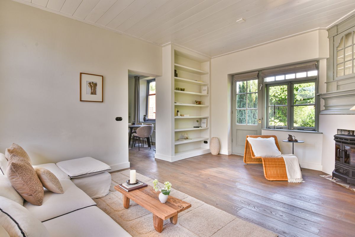 De tweede woonkamer is een sfeervolle ruimte met meerdere ramen voorzien van authentieke ruitjes, waardoor het daglicht prachtig binnenvalt. Deze kamer beschikt over een moderne, stijlvol geïntegreerde keuken met hoogwaardige inbouwapparatuur, die naadloos aansluit op het karakter van het huis. Vanuit deze ruimte is er directe toegang tot de besloten tuin, een fijne buitenruimte die rust en privacy biedt en een veilig en waar eldorado kan zijn voor kinderen gezien de speeltoestellen.