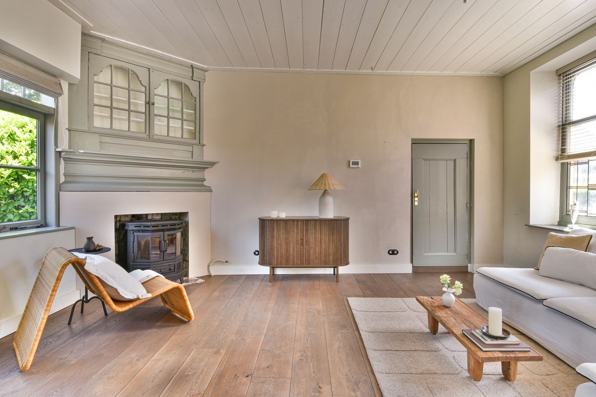 De woonkamer is bijzonder sfeervol en beschikt over een gezellige gietijzeren houtkachel – perfect voor lange avonden bij het haardvuur en een warme, huiselijke sfeer.