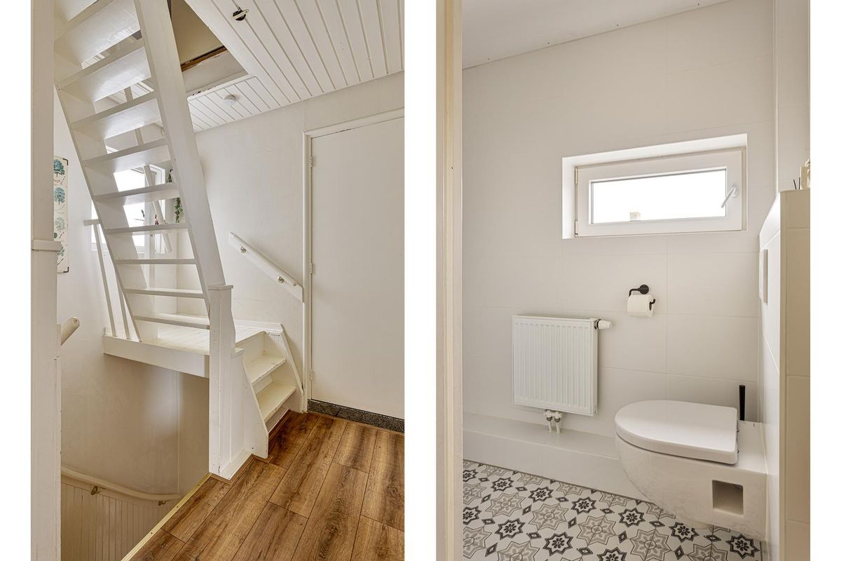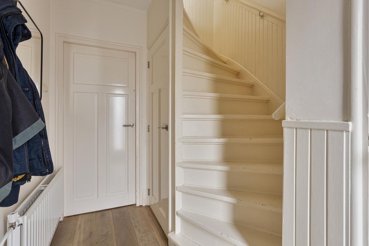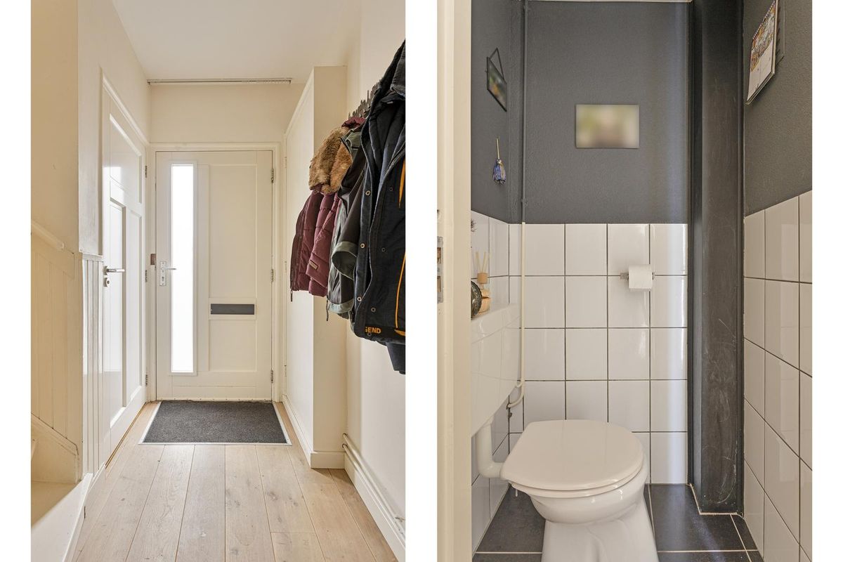 Als je de auto op de oprit hebt geparkeerd, dan loop je zo naar de entree van de woning. In de hal bevindt zich de meterkast, voorzien van 4 groepen, een pv-groep voor de zonnepanelen, 2 aardlekschakelaars en een hoofdschakelaar. Ook vind je hier de betegelde toiletruimte met een staand closet en de trapopgang naar de eerste verdieping. Onder de trap is een handige trapkast voor extra opbergruimte.