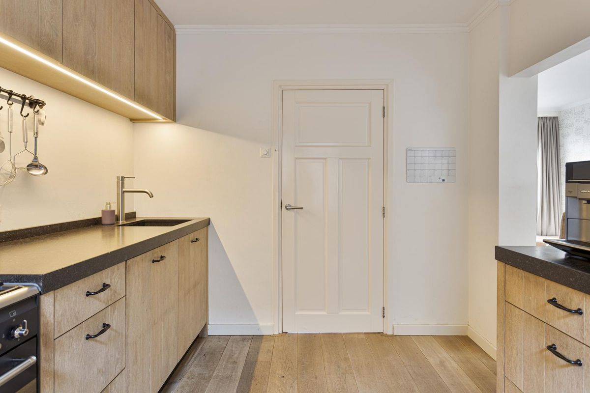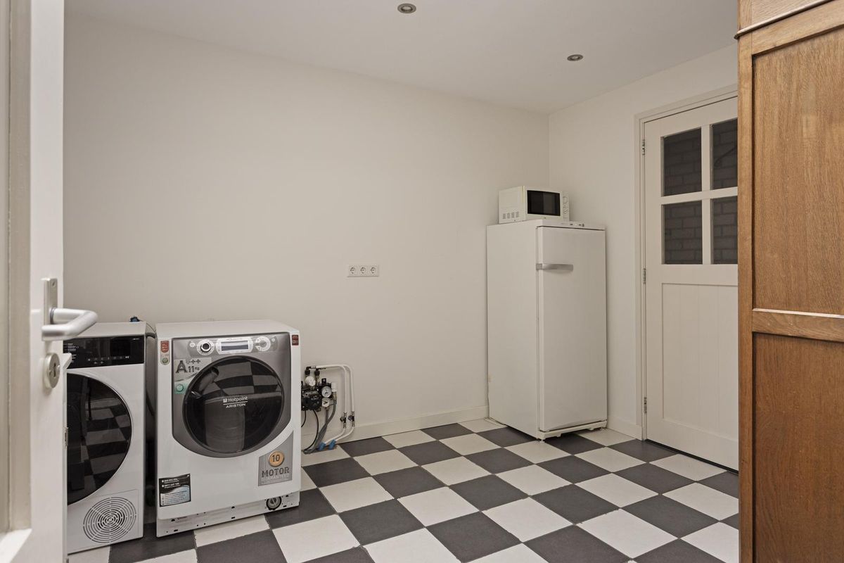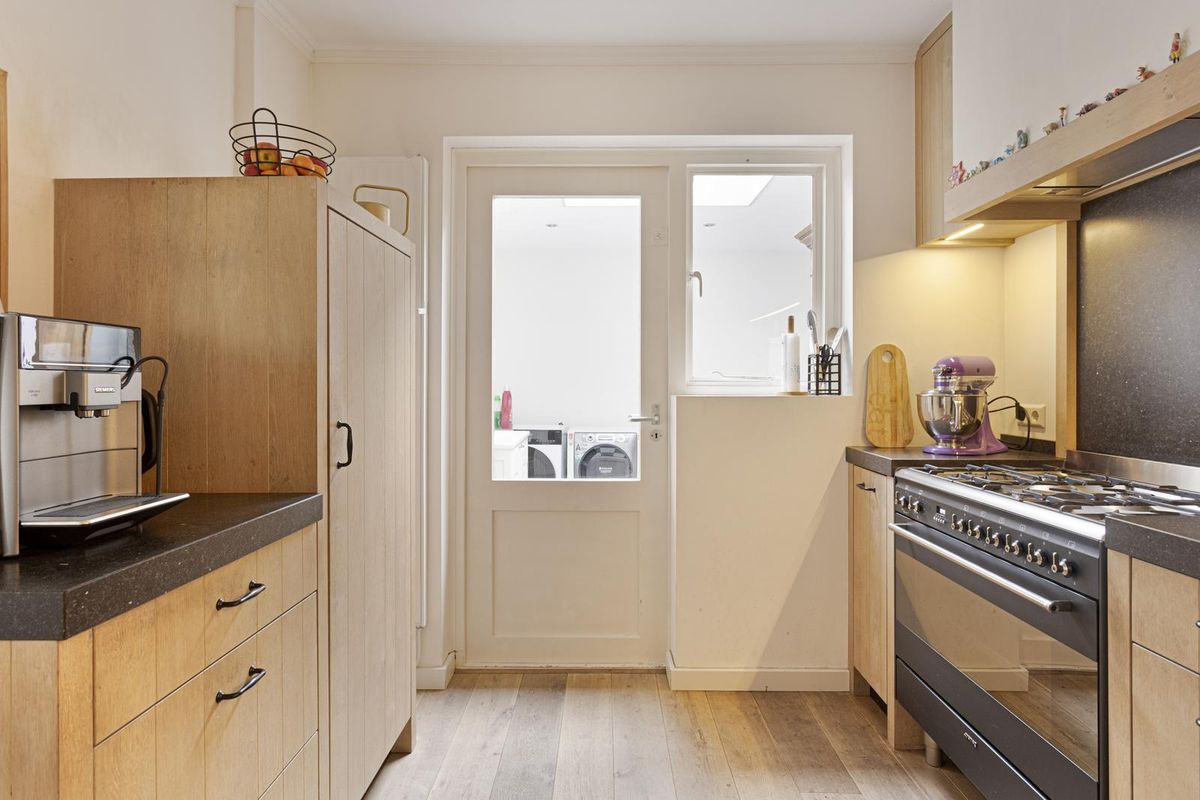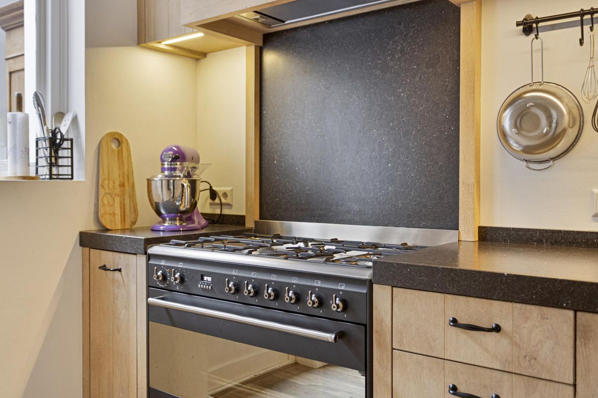 Vanuit de hal loop je door naar de keuken, die in semi-open verbinding staat met de uitgebouwde woonkamer. De keuken is van alle gemakken voorzien. Aan de ene kant tref je diverse onder- en bovenkasten, een spoelbak, een vaatwasser en een Smeg-gasfornuis met 6 gaspitten en een afzuigkap. Aan de andere zijde biedt de keuken extra werkruimte, lades en een koelkast. De aangrenzende bijkeuken is praktisch ingericht, voorzien van een plavuizen vloer met vloerverwarming en aansluitingen voor de was- en droogapparatuur. De lichtkoepel zorgt voor een prettige lichtinval, wat deze ruimte extra aantrekkelijk maakt. Vanuit de bijkeuken heb je toegang tot de zij-entree en de ruime berging, die volledig geïsoleerd is en eveneens voorzien is van een lichtkoepel, elektra en een loopdeur naar de achtertuin.