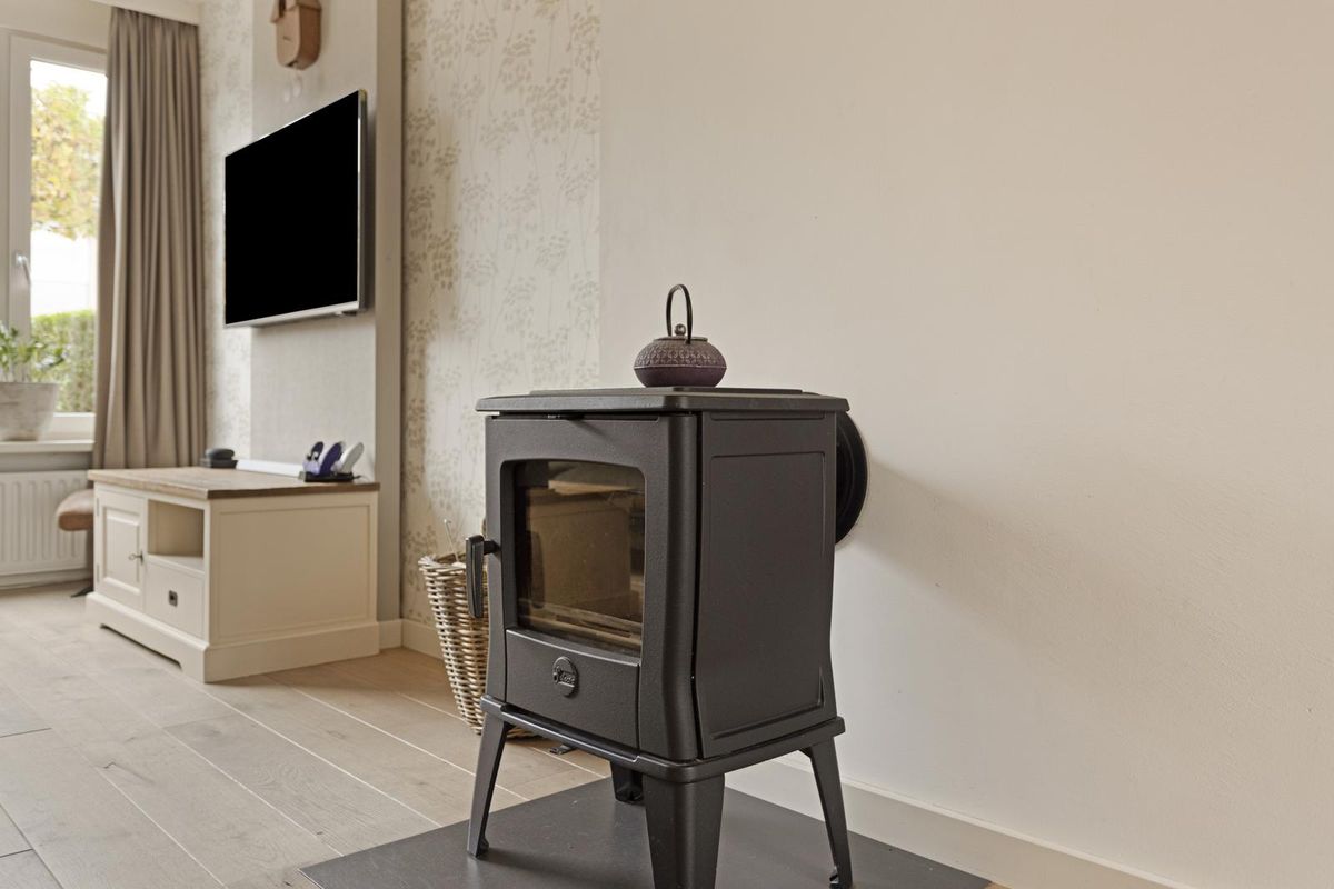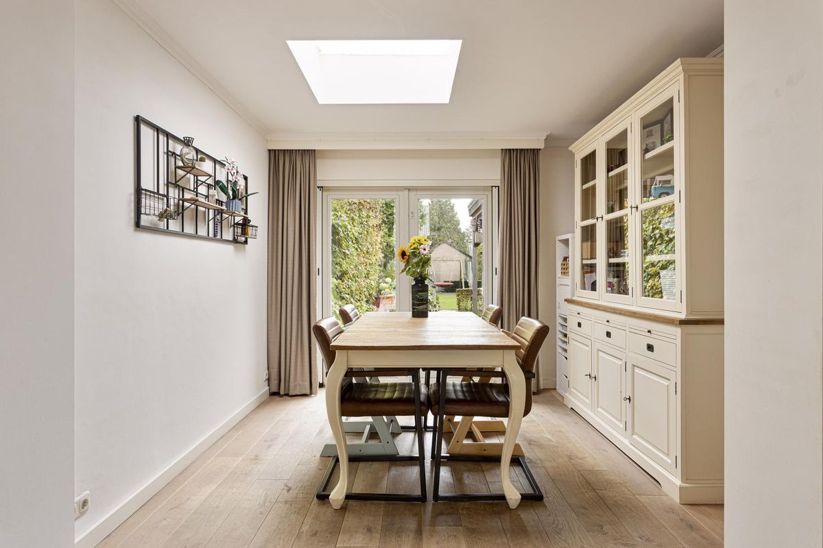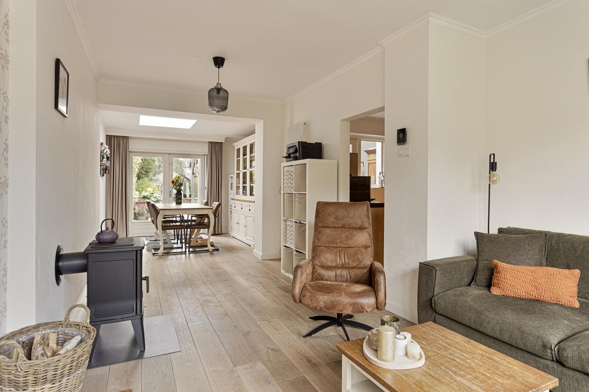 De woonkamer is een uitgelezen plek om tot rust te komen. Het zit- en eetgedeelte is heerlijk licht door de openslaande tuindeuren naar de tuin, en de sfeervolle houtkachel biedt een warme ambiance op koude dagen. De uitbouw van de woonkamer is uitgerust met een lichtkoepel, waardoor je optimaal profiteert van daglicht.