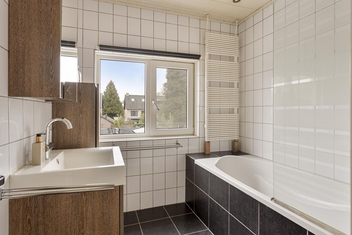 De geheel betegelde badkamer is uitgerust met een ligbad met douchefunctie en een wastafel met meubel. Daarnaast heb je op deze verdieping een modern separaat toilet (geplaatst in 2022).