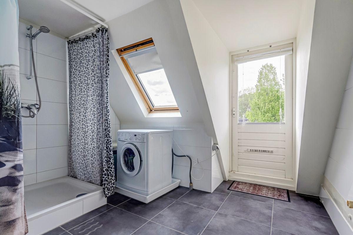 De badkamer aan de tuinzijde beschikt over een douche, vaste wastafel en aansluiting voor wasapparatuur, en geeft toegang tot het ruime dakterras met uitzicht over de daken van Oud-Strijp - ideaal voor een koffie in de ochtendzon of een borrel bij zonsondergang.