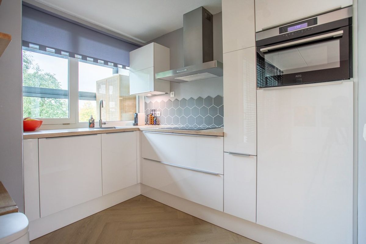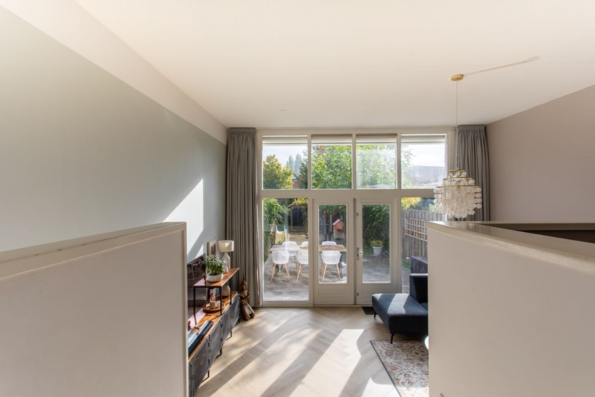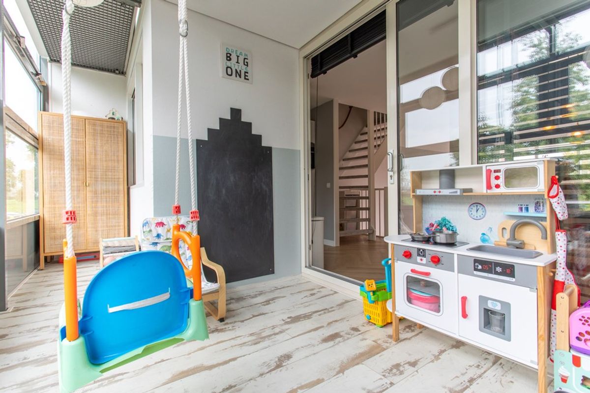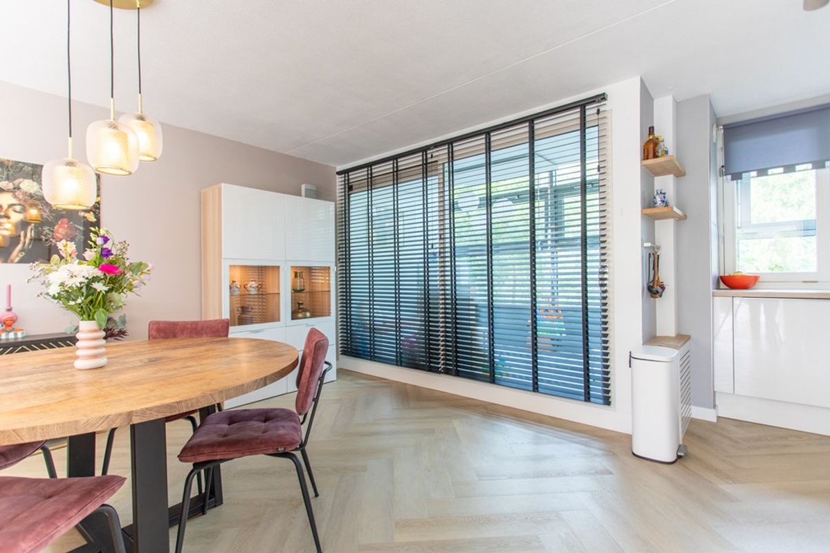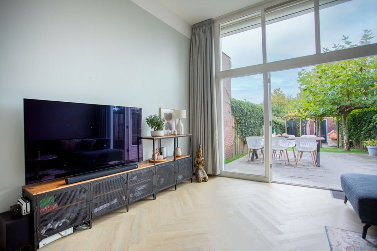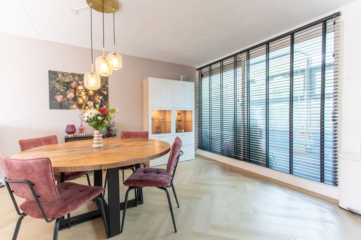 Een halve verdieping hoger kom je in de royale, tuingerichte woonkamer met imposante glaspartij en openslaande deuren naar het terras. De hoogte (ca. 3,60 m), de strakke afwerking en de visgraatvloer geven een luxe, luchtig gevoel en een sterke binnen-buitenverbinding. Nog een halve trap hoger ligt de eetkamer met aansluitend de moderne, greeploze keuken (o.a. inbouwoven, inductiekookplaat, rvs-afzuigkap en design-hexagon spatwand) en de lichte serre/speelkamer over bijna de volle breedte.