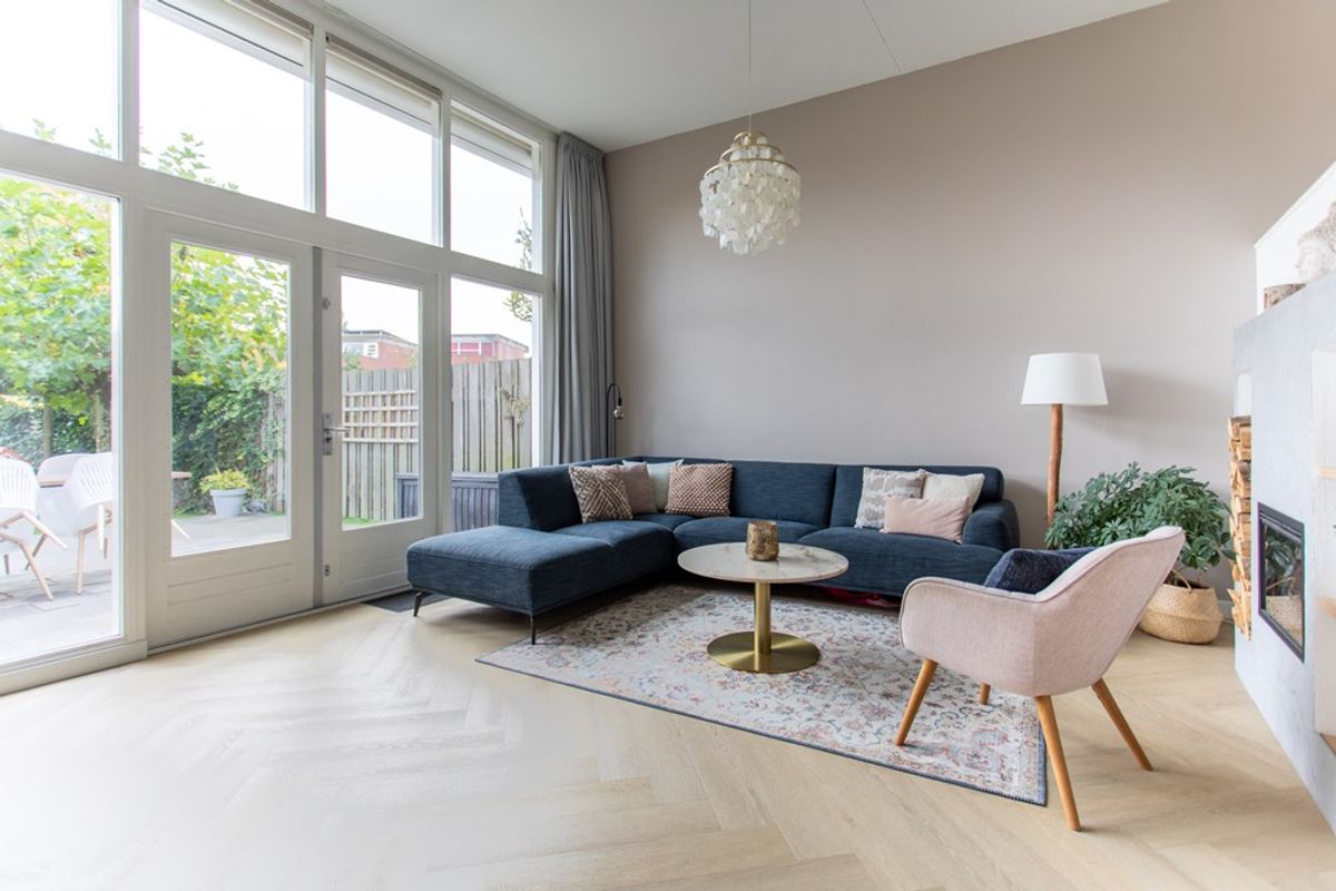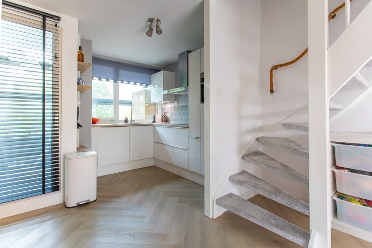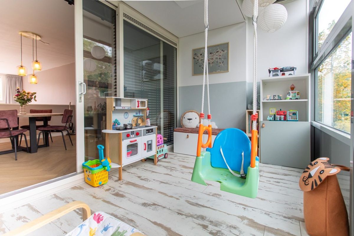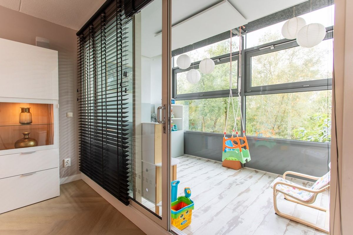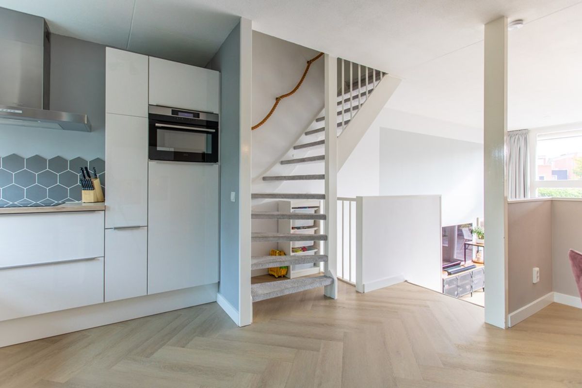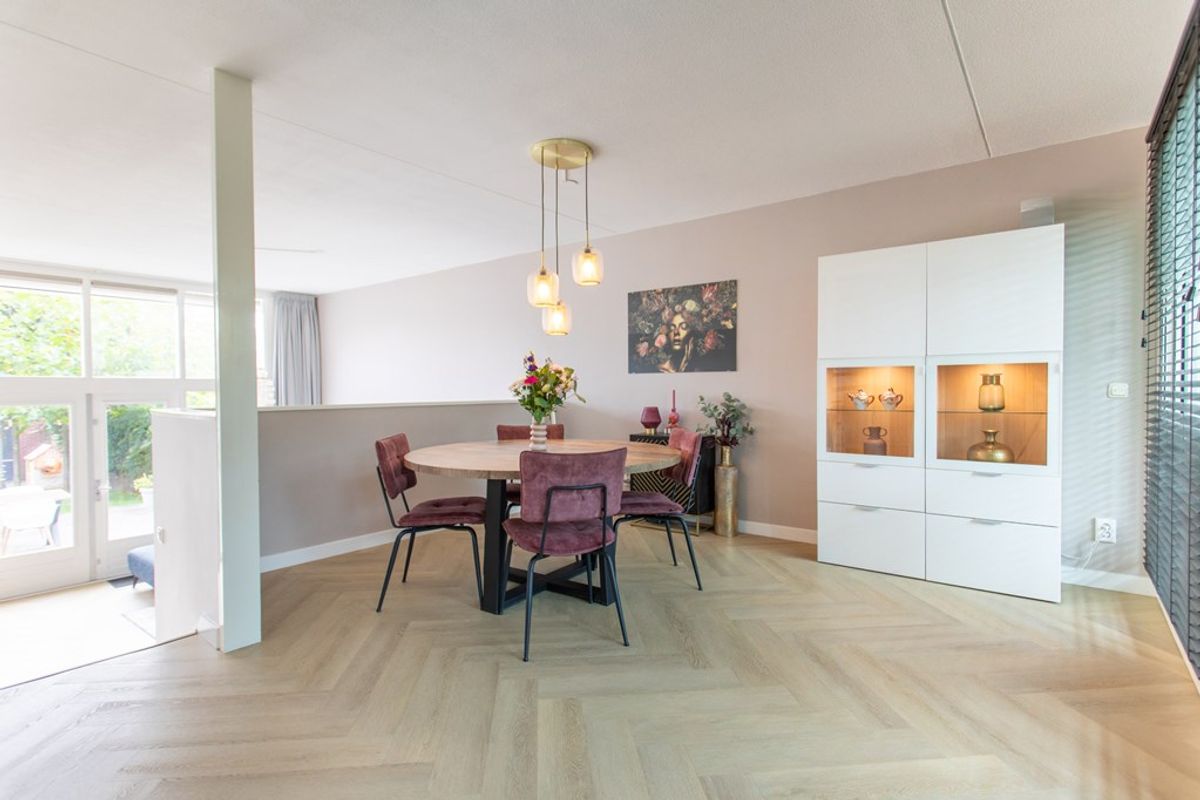 Een halve verdieping hoger kom je in de royale, tuingerichte woonkamer met imposante glaspartij en openslaande deuren naar het terras. De hoogte (ca. 3,60 m), de strakke afwerking en de visgraatvloer geven een luxe, luchtig gevoel en een sterke binnen-buitenverbinding. Nog een halve trap hoger ligt de eetkamer met aansluitend de moderne, greeploze keuken (o.a. inbouwoven, inductiekookplaat, rvs-afzuigkap en design-hexagon spatwand) en de lichte serre/speelkamer over bijna de volle breedte.