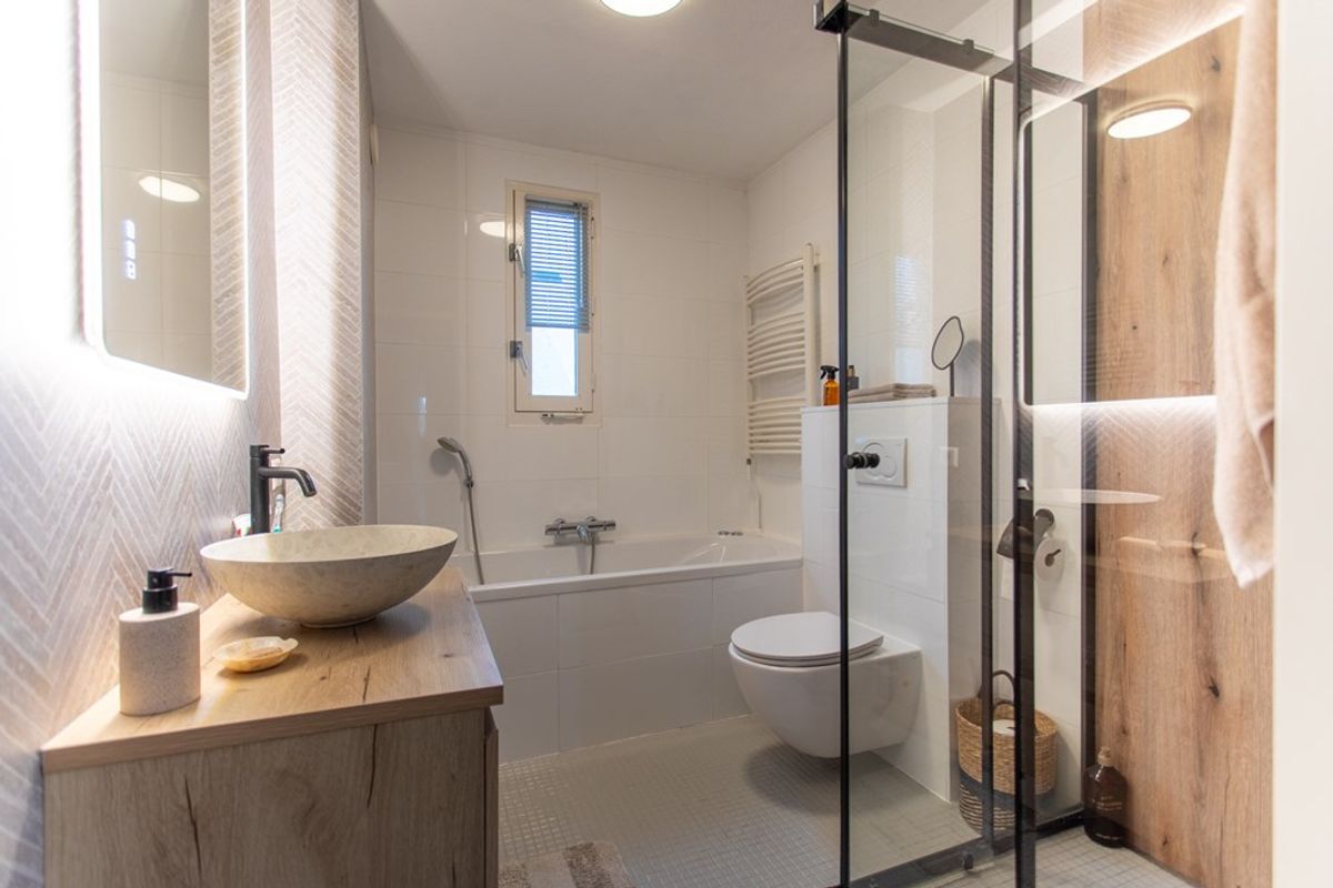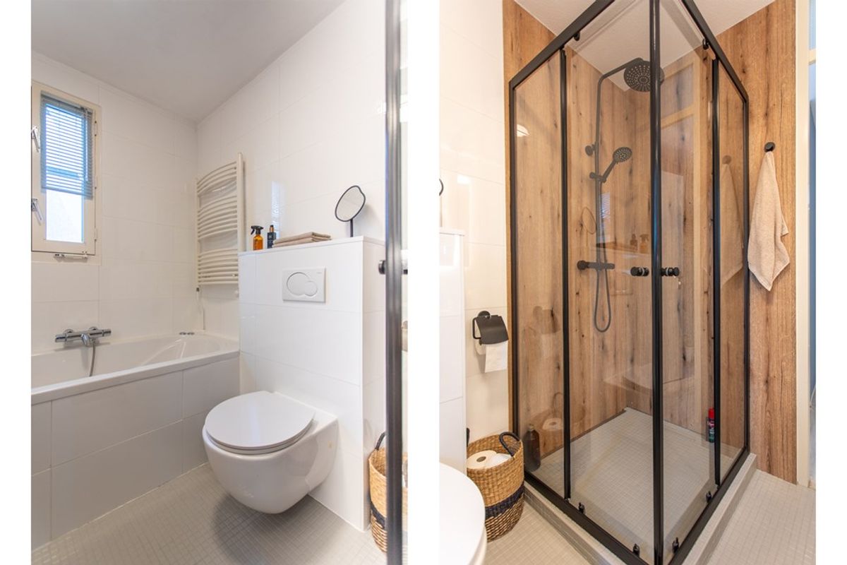 On the bedroom level (with laminate flooring on the landing), there are three well-sized bedrooms. The rear rooms have recently been expanded with a dormer window. The bathroom is contemporary and fully equipped, featuring a bathtub, separate shower, washbasin cabinet, and toilet. A fixed staircase leads to the top floor, which offers a landing with space for a washing machine, dryer, and central heating system, as well as a very spacious bedroom and a second bathroom with toilet, shower, and washbasin.