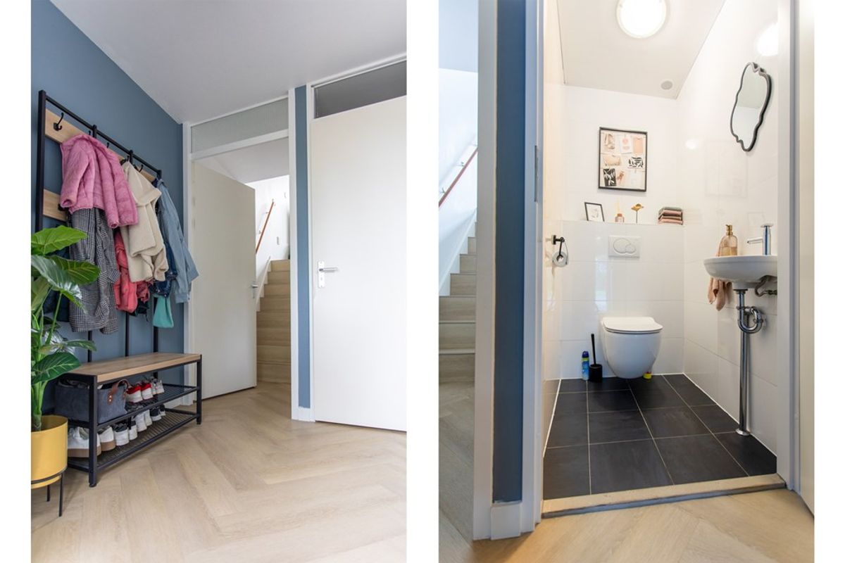 We starten bij de voordeur in de representatieve hal met visgraatvloer. Hier vind je het moderne toilet met fonteintje en een praktische garderobe. Aan de straatzijde ligt een ruime werkkamer/praktijk met veel daglicht; ideaal voor thuiswerken of salon. Vanuit de hal leidt de trap je de woning in.