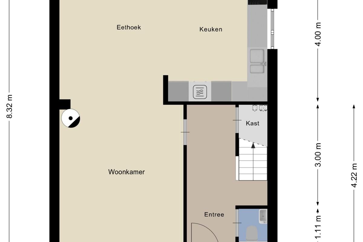 Begane grond: Entree, hal met trapopgang naar de 1e verdieping, wandtoilet met fontein, trap/meterkast, woonkamer met openslaande tuindeuren, open keuken met toegang naar de tuin.