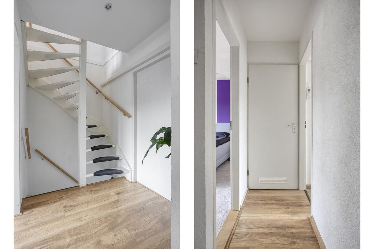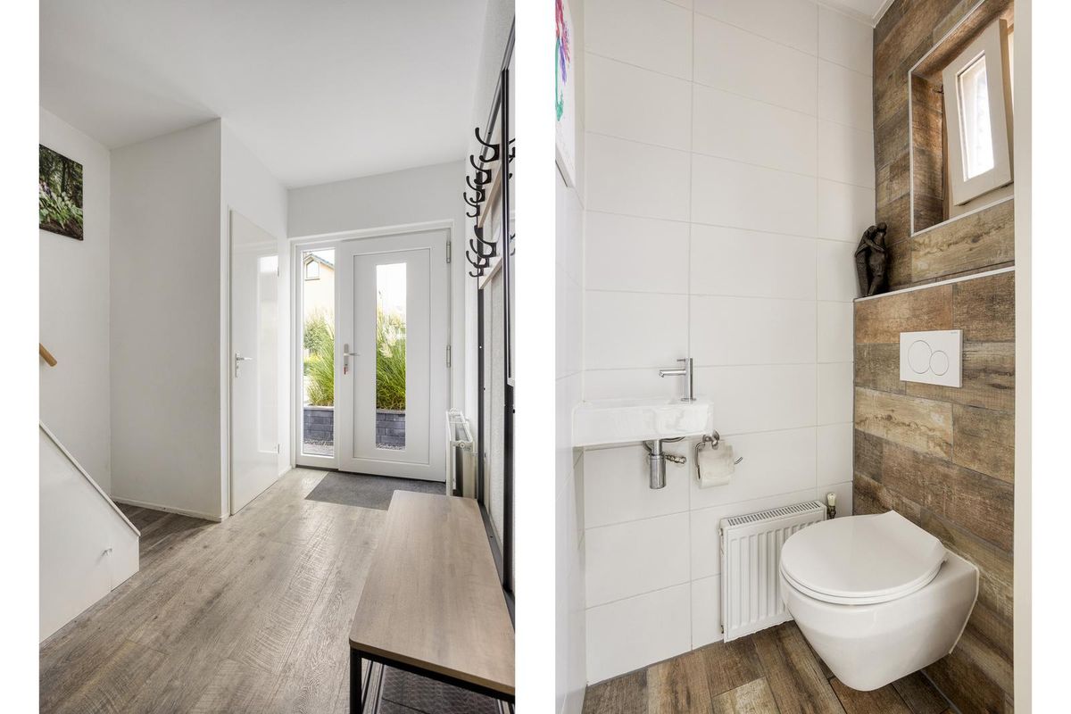 Via de brede oprit is de entree van de woning te bereiken. Ruime en lichte hal met trapopgang naar de 1e verdieping, modern wandtoilet met fontein, trap/meterkast, toegang naar de woonkamer.