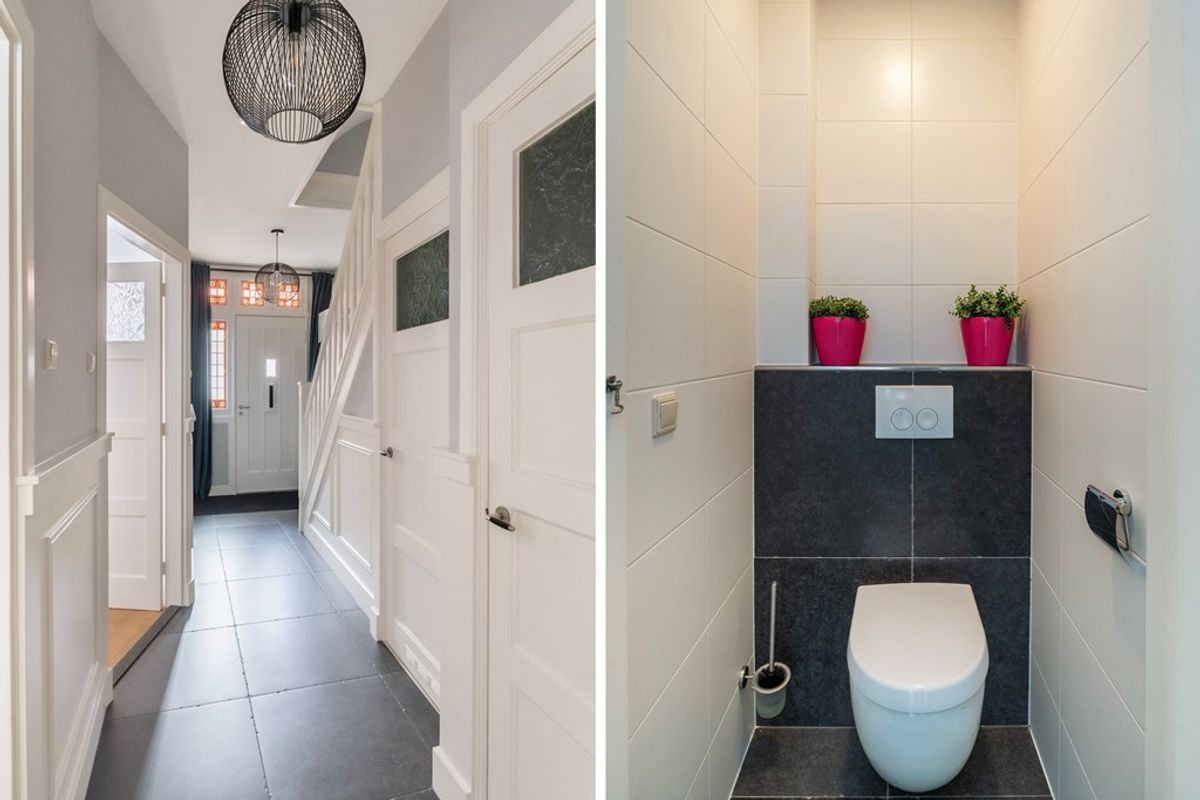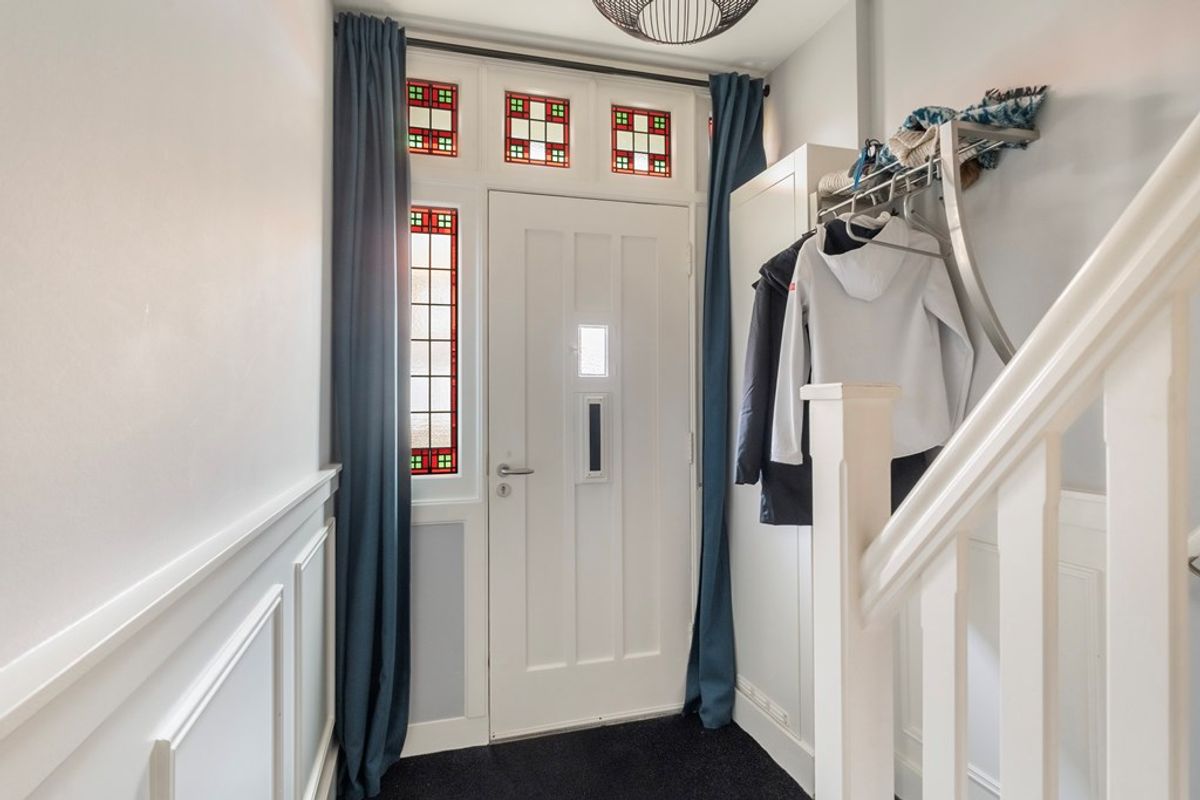 Entree via klassieke jaren '30 voordeur. Hal met glas-in-lood ramen afgewerkt in dubbelglas, ruime trapkast en modern toilet. De sfeervolle kamer en suite is absoluut een eyecatcher: schuifdeuren met geslepen glas, een natuurstenen schouw met pelletkachel, visgraat houten vloerdelen en openslaande deuren naar de tuin.