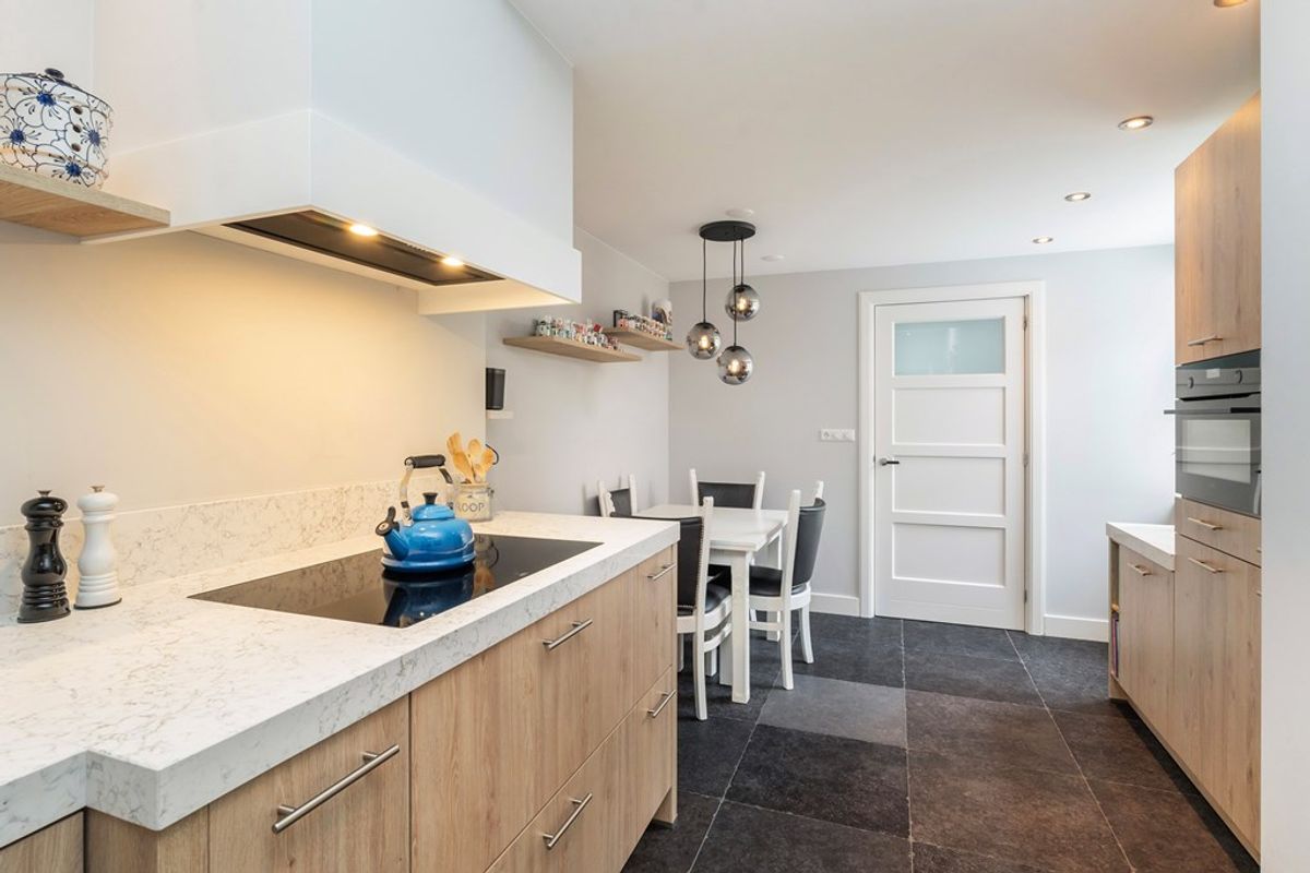 Aan de achterzijde bevindt zich de ruime, luxe, nieuwewoon keuken (2023) met plavuizenvloer (vloerverwarming), fraai werkblad, veel kasten en hoogwaardige inbouwapparatuur: inductiekookplaat, afzuigkap, oven met magnetronfunctie, XXL vaatwasser, koel-vriescombinatie en een Quooker.