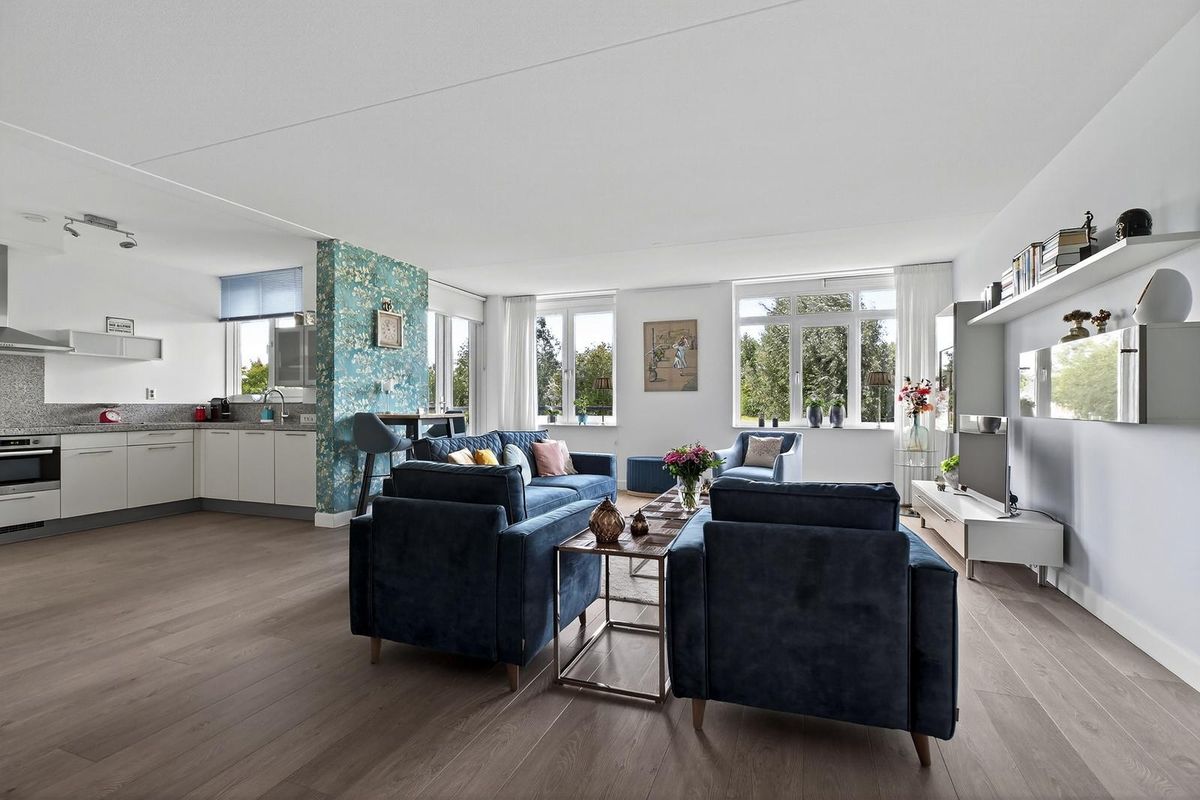 De woonkamer van circa vijftig vierkante meter is royaal van opzet en valt direct op door de grote ramen en de hoeveelheid licht die naar binnen stroomt. Dankzij de ligging op het westen geniet u hier in de middag en avond van prachtige lichtinval en een vrij uitzicht over het park. Via dubbele deuren heeft u toegang tot het ruime balkon van meer dan tien vierkante meter. Dit is een heerlijke plek om lange zomeravonden door te brengen met een drankje, of gewoon om te genieten van de rust en het uitzicht op het groen.