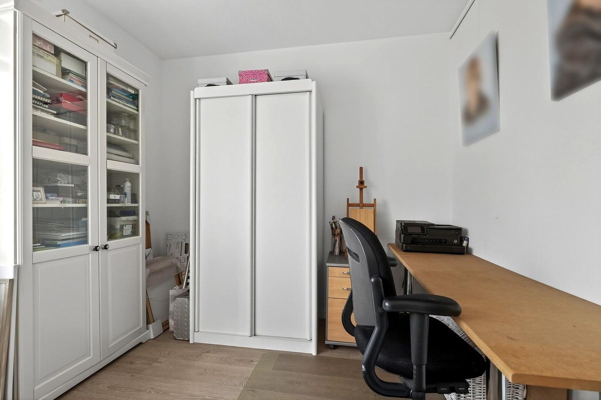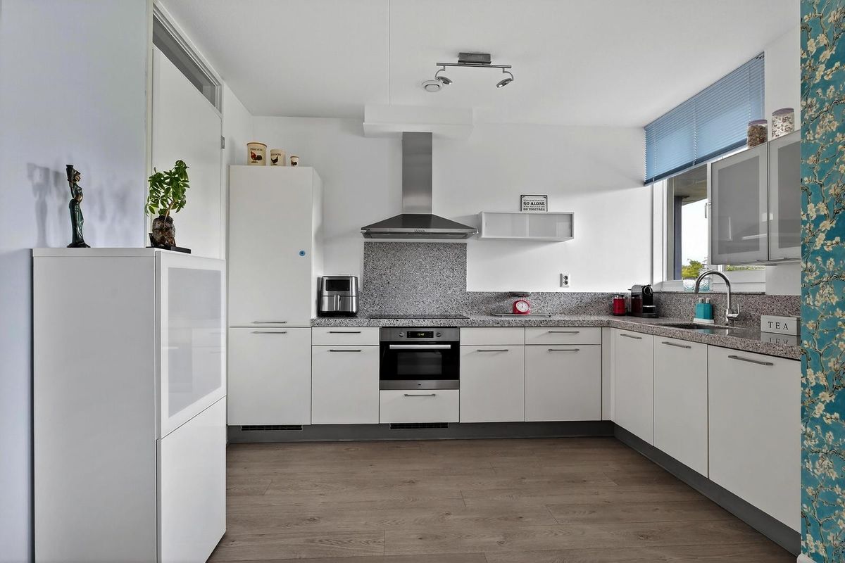 De woonkamer staat in open verbinding met de keuken van circa zeven vierkante meter. Deze is uitgevoerd in een hoekopstelling en voorzien van de gebruikelijke inbouwapparatuur. Het is een keuken die niet alleen praktisch is, maar ook uitnodigt om uitgebreid te koken. Vanuit het keukenraam kijkt u uit richting het balkon en het park, waardoor koken hier altijd een plezierige bezigheid is. Aangrenzend vindt u de praktische bijkeuken van ongeveer vijf vierkante meter, waar extra werk- en bergruimte aanwezig is. Hier bevinden zich tevens de cv-opstelling en aansluitingen voor wasmachine en droger, netjes uit het zicht maar altijd binnen handbereik.