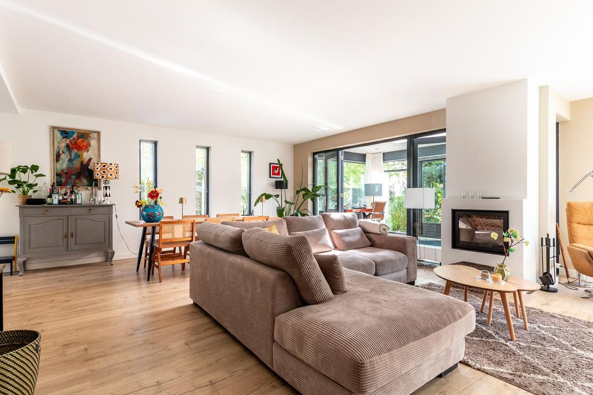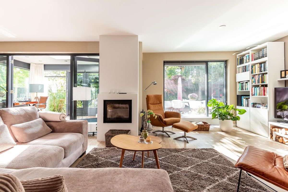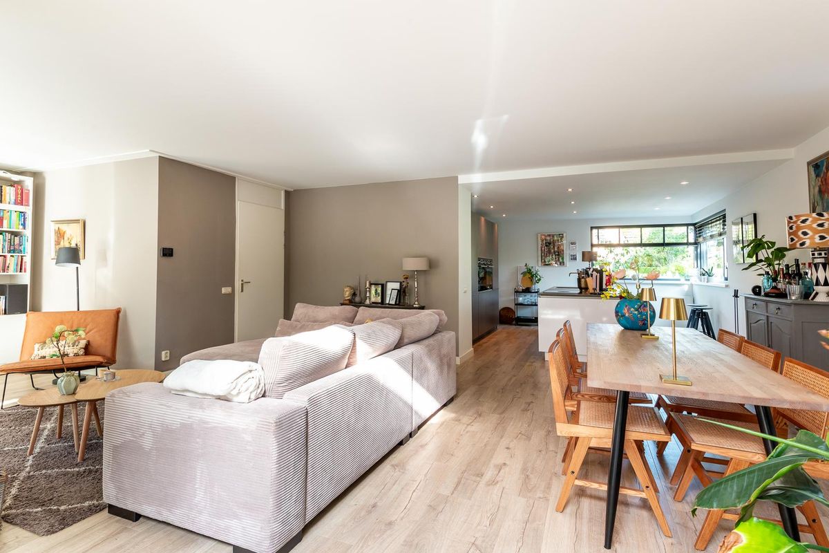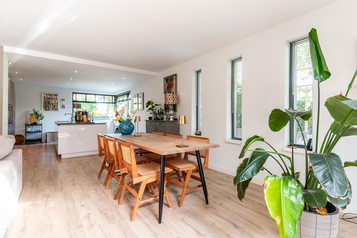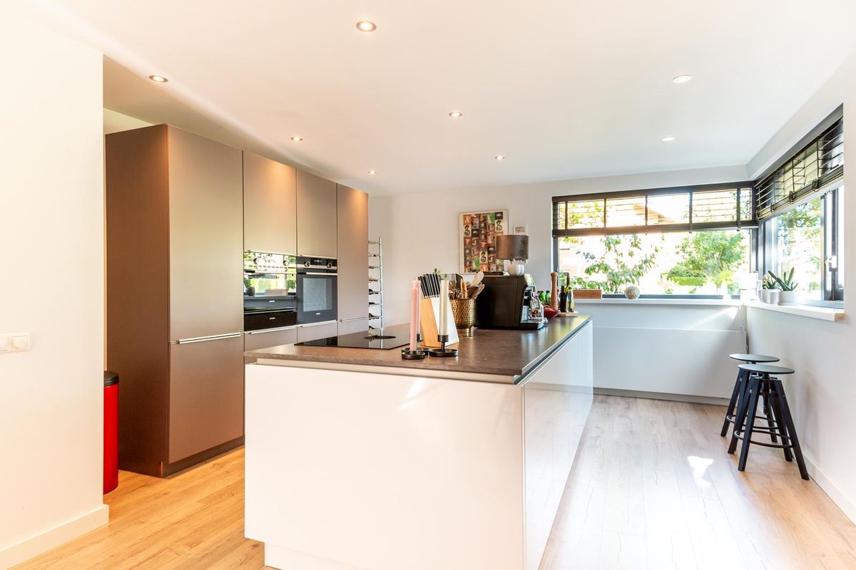 De moderne woonkeuken is een echte eyecatcher. Een groot kookeiland met kookplaat, geïntegreerde afzuiging, vaatwasser en veel opbergruimte vormt het hart van de keuken. Aan de muurzijde vind je een strak keukenmeubel met Quooker, oven, combi-oven en een warmhoudlade, magnetron, warmhoudlade, koel-vriescombinatie en extra kastruimte. Het verlaagde plafond met inbouwspots geeft de ruimte een moderne en warme sfeer. Dankzij de hoekramen geniet je hier bovendien van veel licht en een fijn uitzicht op de voortuin.