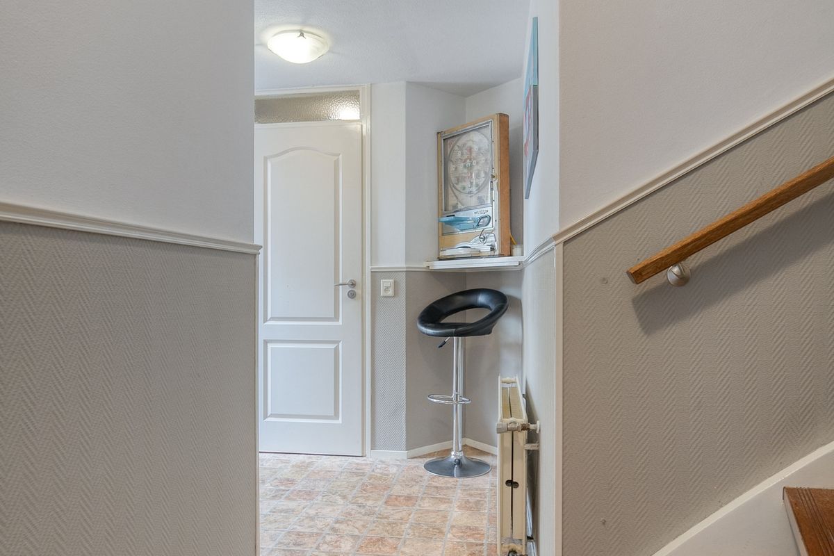 Entree/hal met meterkast, trapopgang en een toilet. De woonkamer beschikt over veel lichtinval, een houtkachel (ter overname) en de keukenopstelling met diverse inbouwapparatuur, o.a. gaskookplaat en een afzuigkap. Via de bijkeuken bereikt u de achtertuin en de garage.