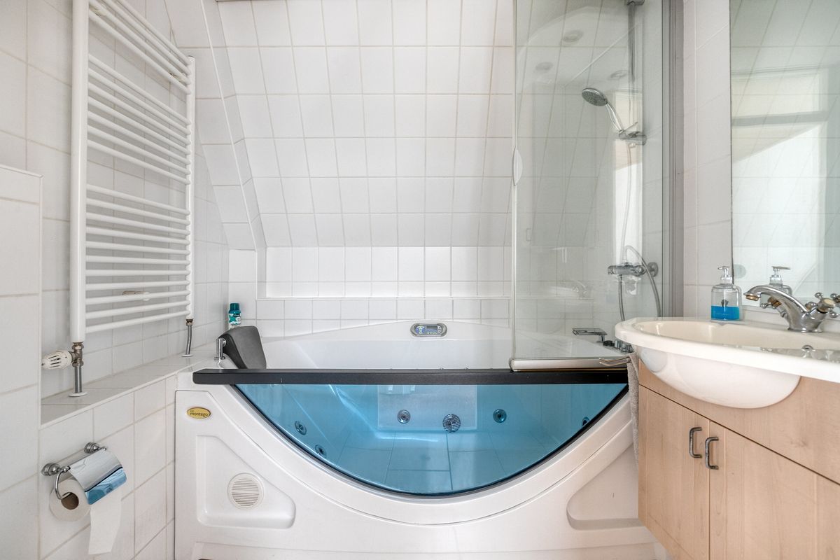 Overloop met trapopgang en 3 slaapkamers. De badkamer is voorzien van een toilet, wastafel in meubel en een ligbad met douche. Via de grootste slaapkamer bereikt u het grote dakterras.
