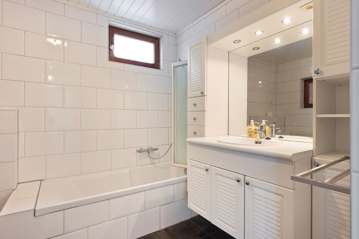 Volledig betegelde badkamer welke voorzien is van een ligbad met douchecombinatie, wastafel met opbergmeubel en een toilet. De aansluitingen voor de wasmachine/wasdroger alsmede de cv-installatie bevinden zich hier.