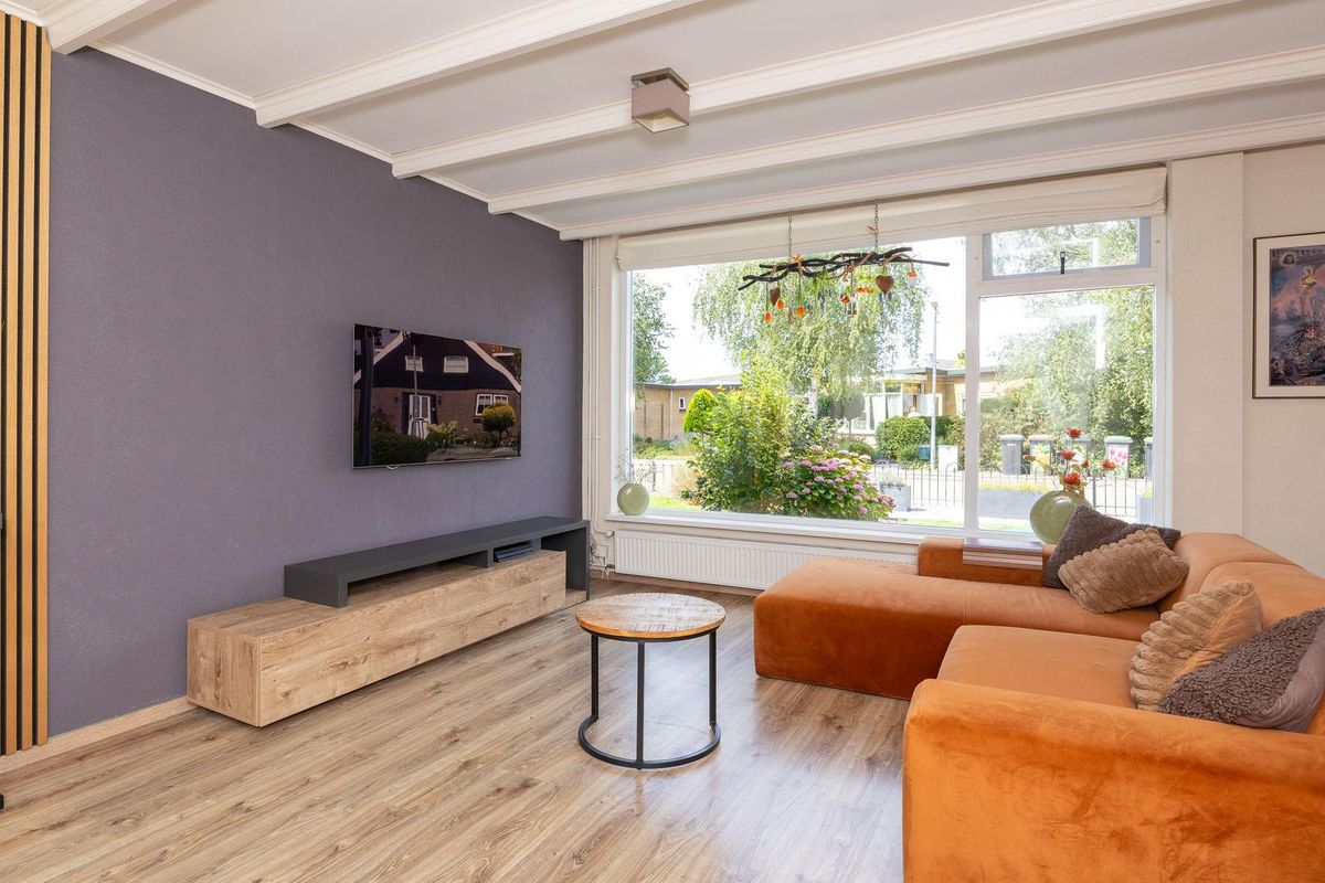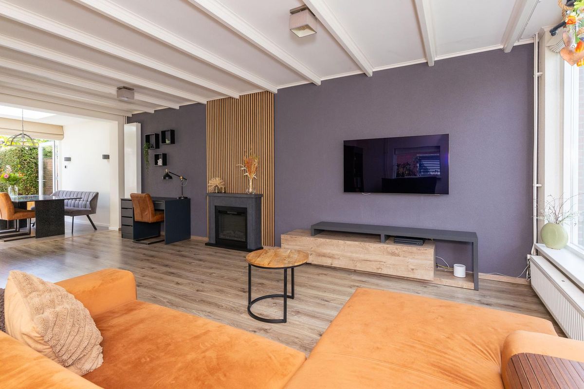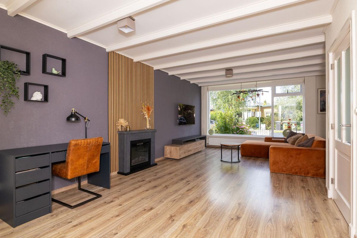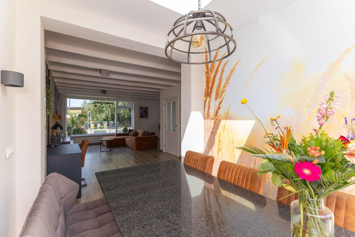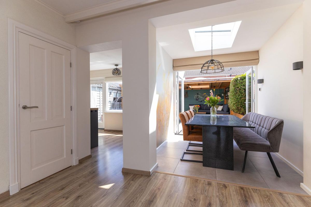 Woonkamer – Lichte doorzonkamer met straatzicht aan de voorzijde, royale eethoek bij de uitbouw én een lichtstraat die zorgt voor extra daglicht. Via de openslaande deuren loop je zo de tuin in.