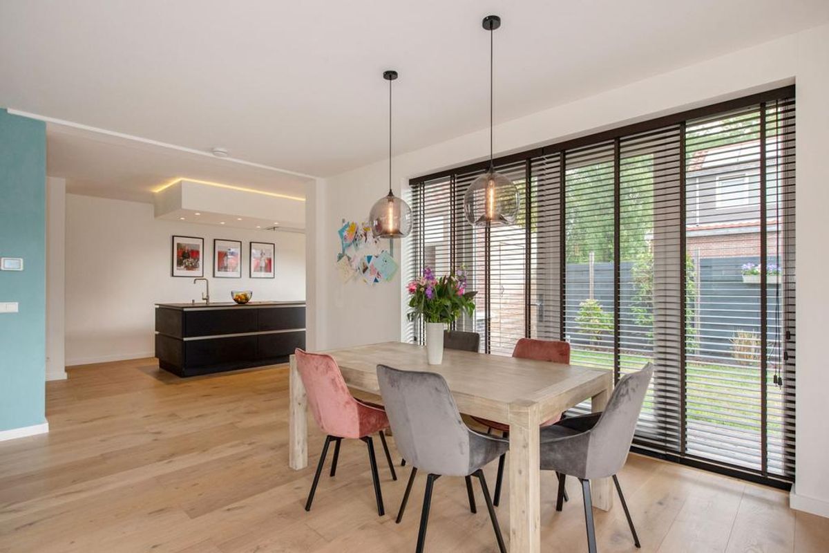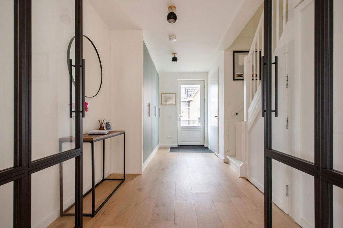 Entree via de voortuin. De ruime hal beschikt over een modern toilet met fonteintje, drie inbouwkasten en de meterkast. Onder de trap bevindt zich extra bergruimte met de warmtepomp en de cv-installatie. Via stijlvolle stalen taatsdeuren komt u in de luxe keuken met groot kookeiland, afgewerkt in matzwart met een keramisch werkblad. De keuken is volledig uitgerust met hoogwaardige inbouwapparatuur, waaronder een hoge koelkast en vriezer, stoomoven, ingebouwde koffie-/espressomachine, vaatwasser en combimagnetron. De ruime en lichte woonkamer staat in directe verbinding met de verzorgde tuin dankzij meerdere openslaande deuren. De tuin loopt rondom de woning (voor-, zij- en achtertuin) en biedt volop keuze tussen zon en schaduw. De tuin is goed beschut met een combinatie van schuttingen en verzorgde hagen. Achterin de tuin bevindt zich een houten berging met elektra, met daarachter de buitenunit van de warmtepomp.