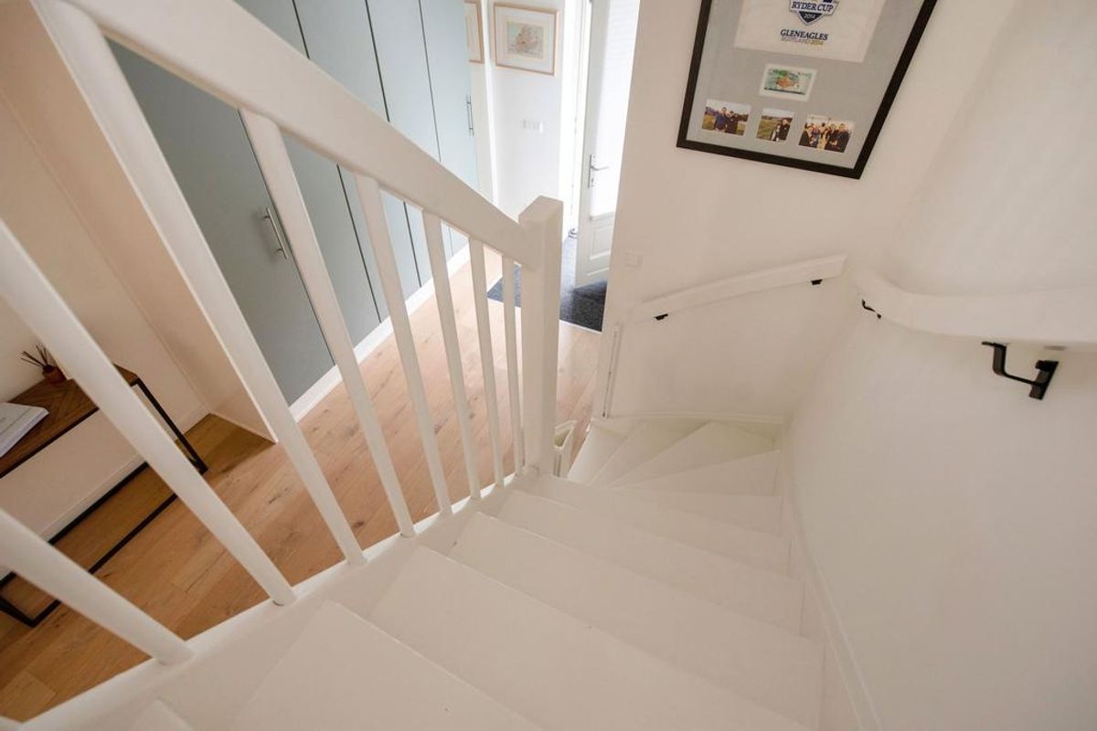 Vaste trap naar de ruime zolder. Deze multifunctionele ruimte biedt talloze mogelijkheden, zoals een extra slaapkamer, werkruimte of speelkamer. De zolder heeft bovendien uitstekende bergruimte en kan nog verder worden verbouwd om de ruimte optimaal te benutten.