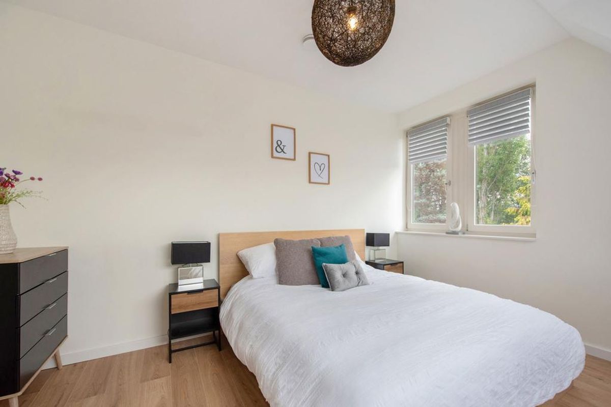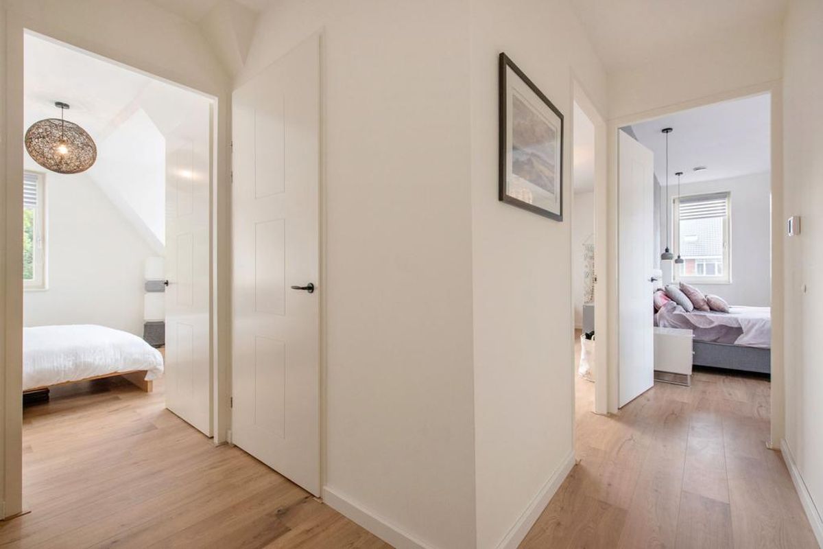 Overloop. Aan de voorzijde bevindt zich een ruime slaapkamer met ramen aan twee zijden, wat zorgt voor veel natuurlijk licht. Aan de achterzijde bevinden zich nog twee ruime slaapkamers. De luxe badkamer is volledig uitgerust met een vrijstaand bad, ruime inloop-(regen)douche met zitbank, dubbele wastafel met inbouwkranen en verlichte spiegel, handdoekradiator, toilet en comfortabele vloerverwarming. Op de overloop bevindt zich een vaste kast ingericht als praktische wasruimte met aansluiting voor wasmachine en droger.