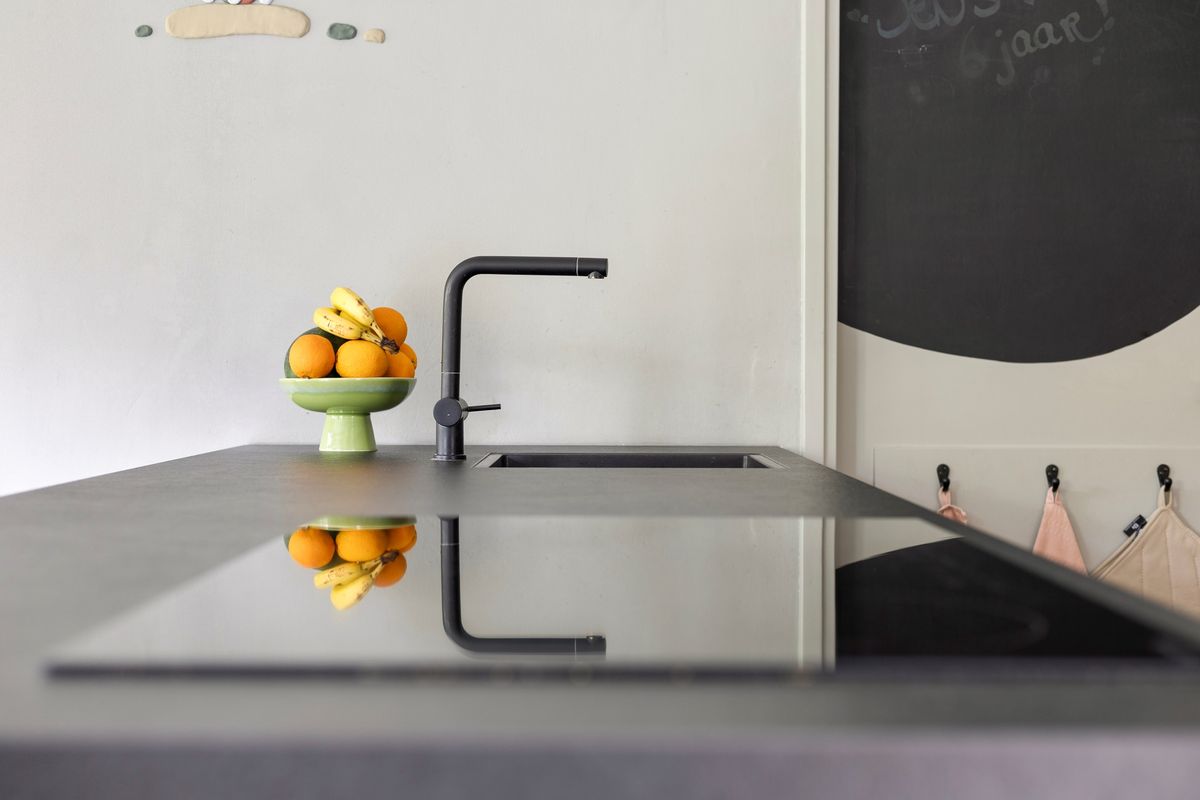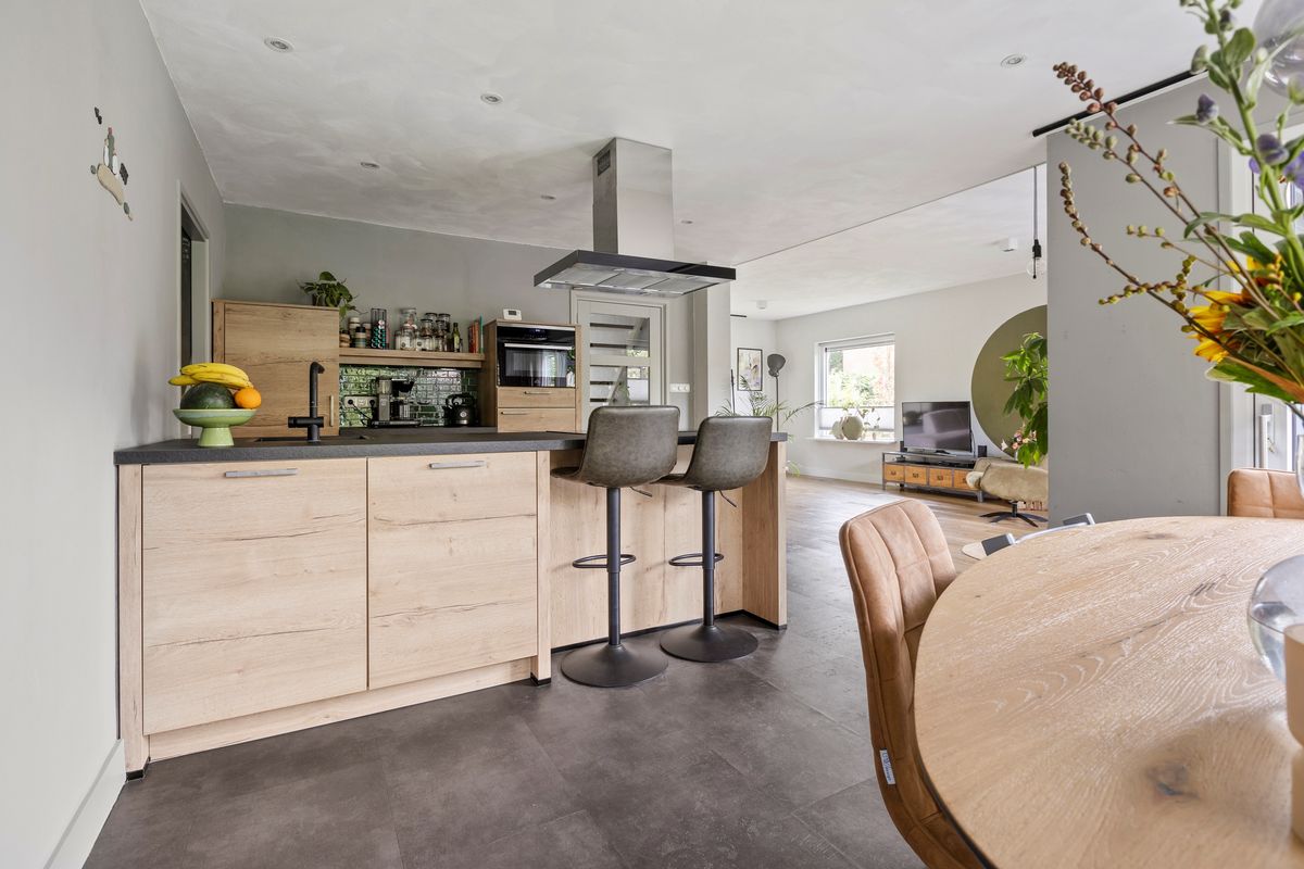 Via de entree aan de voorzijde van de woning komen we binnen in de hal, waar ook het toilet, de meterkast en de trapopgang naar boven zijn gesitueerd. Aan de rechterkant is een kamer gelegen die zowel als slaapkamer of als studeerkamer kan worden gebruikt. Vanuit de hal lopen we rechtdoor naar de woonkamer met half open keuken. De gehele begane grond is overigens voorzien van vloerverwarming voor extra comfort. Hoewel de keuken half open is, komt het verschil in ruimtes mooi tot zijn recht doordat de keuken is voorzien van een prachtige pvc-vloer met tegellook en in de woonkamer een pvc-vloer met houtlook. Dit zorgt ook voor een warme sfeer in de woonkamer. De hoge kwaliteit afwerking is te zien aan de strak gestucte wanden, hoge plinten en kunststof kozijnen. Ook de keuken is luxe te noemen met diverse inbouwapparatuur, zoals een inductiekookplaat (3-fasen aansluiting), combimagnetron, koelkast en vaatwasser. Aan het kookeiland is bovendien een barzitje gecreëerd, zodat je je gesprek niet hoeft te onderbreken tijdens het koken. Via de tuindeur stap je zó de prachtige tuin in! Aansluitend bij de keuken is een berging met ruimte voor een grote koel-vriescombinatie en het opbergen van provisie. Naast de keuken is ook de bijkeuken gelegen met ruimte voor witgoed en een spoelbak. Vanuit hier heb je direct toegang tot de tuin en de aangebouwde garage.